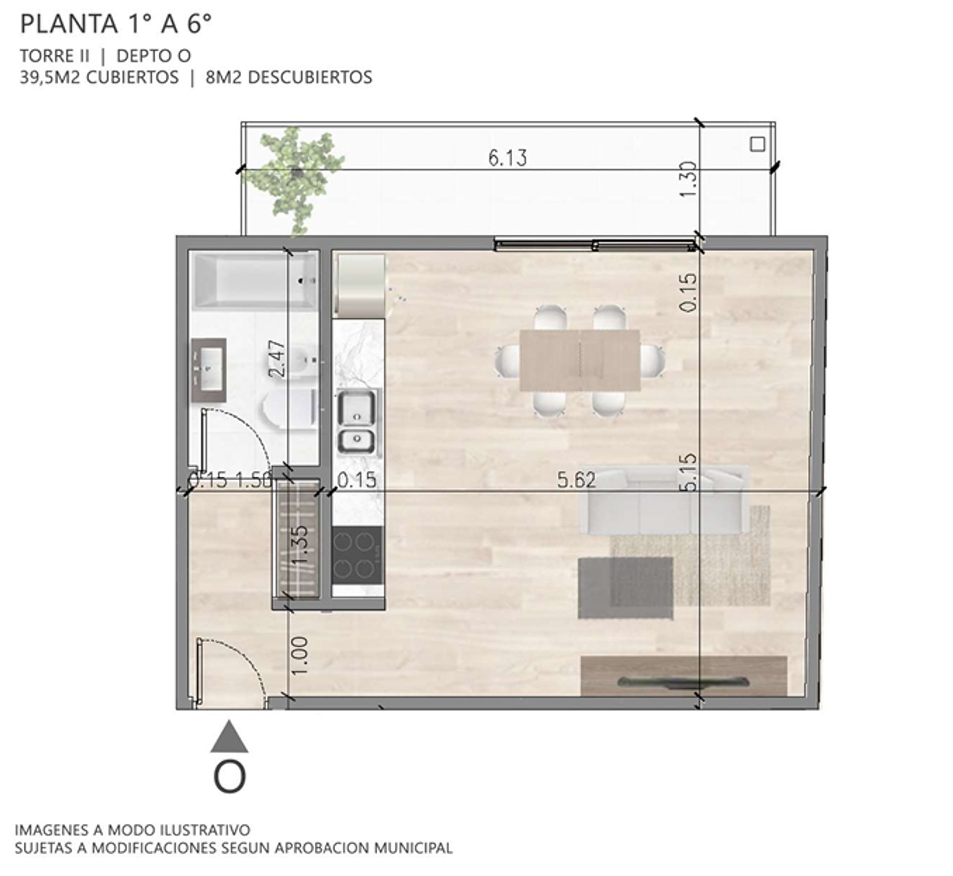 El proyecto comprende dos módulos distribuidos en seis pisos, con ocho departamentos por planta, todos de tipología monoambiente. Las unidades presentan superficies que varían entre 32 y 47 m² cubiertos, con balcones propios, cocina integrada y baño completo. Algunas unidades ofrecen metraje adicional que permite la conversión en dos ambientes, brindando versatilidad a la inversión.