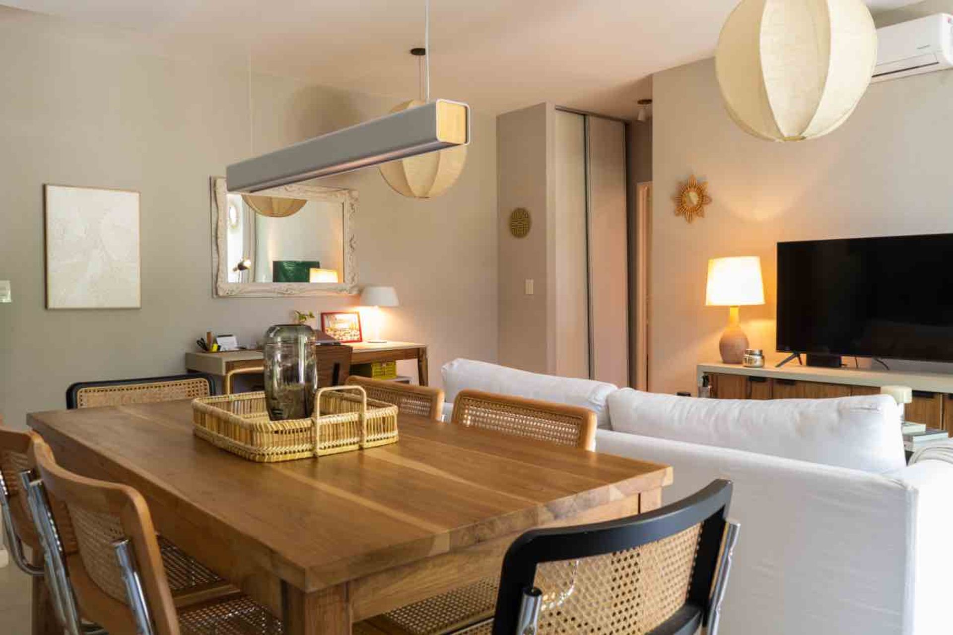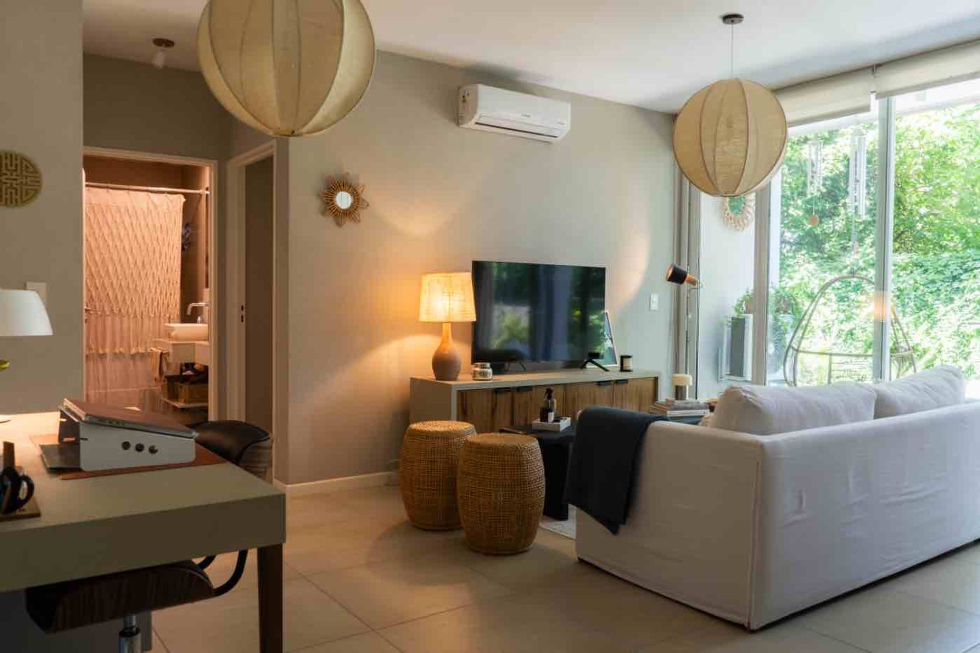 El espacio se distribuye con un living–comedor que cuenta con un gran ventanal que abre al jardín, una cocina integrada con salida al exterior, un baño completo y un dormitorio amplio con placard, todo en un ambiente muy luminoso y confortable.