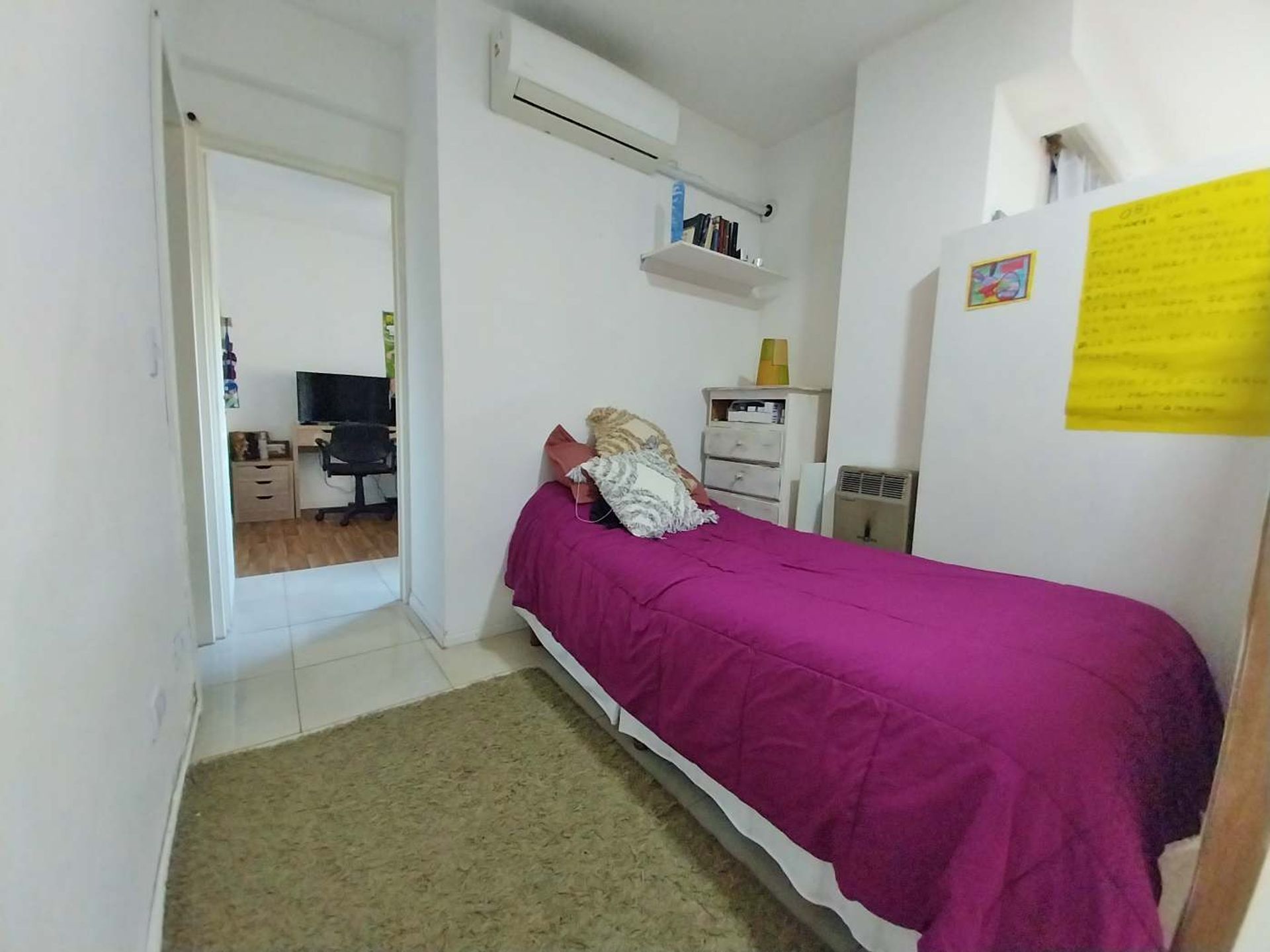 El dormitorio dispone de placard de piso a techo, ventana con vidrios DVH y aire acondicionado. El baño completo incluye bañera, mientras que la calefacción se gestiona mediante estufa tiro balanceado y aire acondicionado frío/calor en el living comedor.
