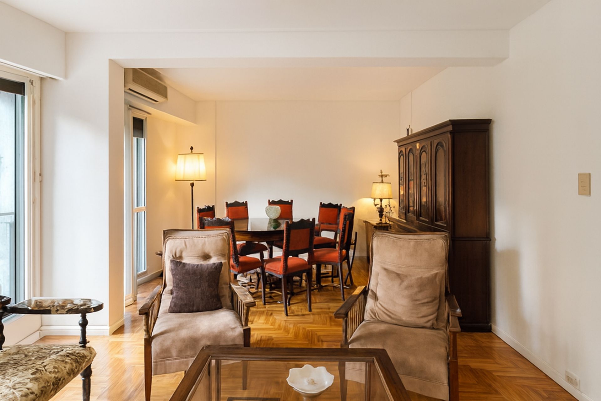 El dormitorio principal cuenta con baño en suite, ofreciendo un refugio privado. El segundo dormitorio dispone de placard y baño completo, asegurando comodidad y privacidad para invitados o familiares. Los pisos de parquet se mantienen en excelente estado de conservación, añadiendo un toque de distinción a cada ambiente.