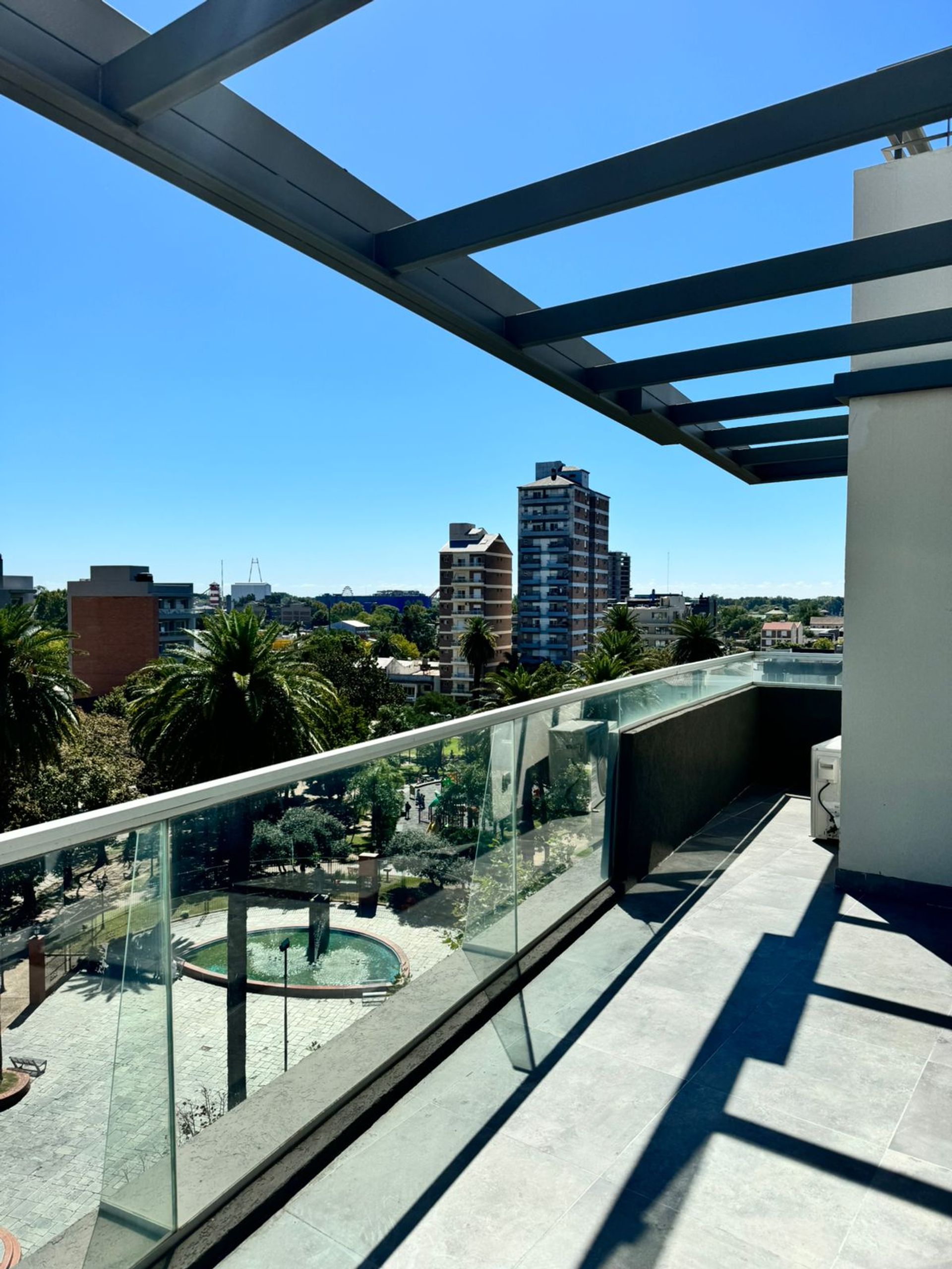La cocina, totalmente equipada, incluye cocina a gas, horno eléctrico y microondas. El comedor, con balcones en ambos lados, ofrece una vista privilegiada de la plaza. Cada uno de los tres dormitorios, incluido el principal en suite, dispone de un amplio placard interior.