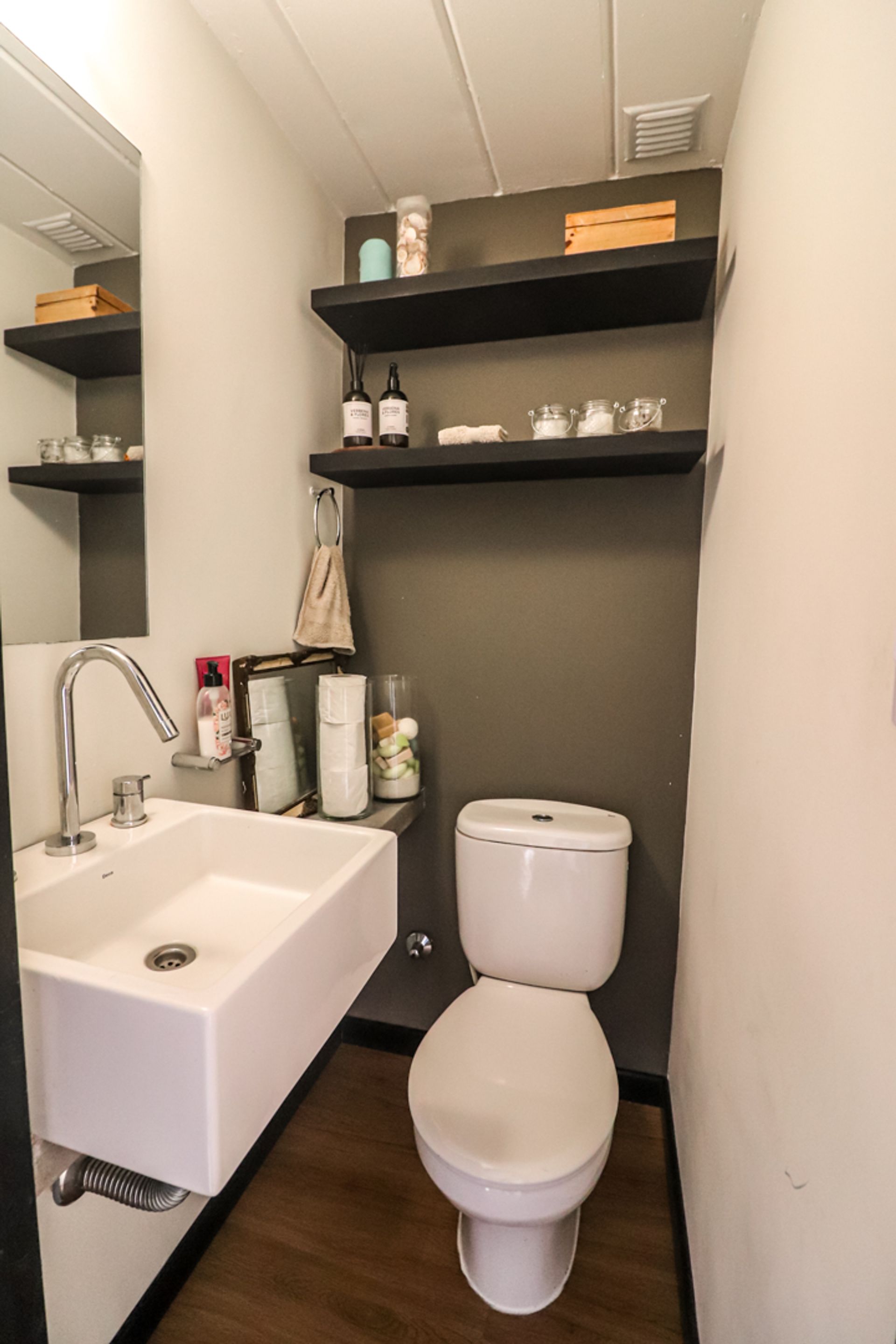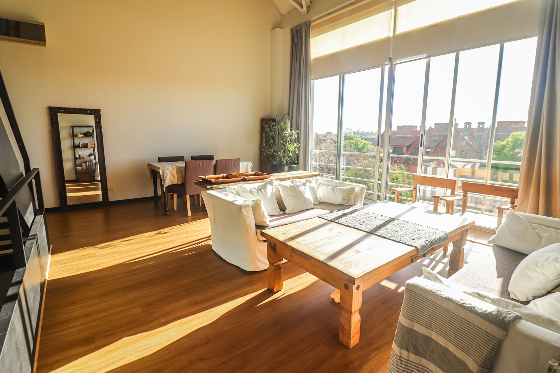 El acceso al departamento se realiza mediante ascensor y una escalera que conduce a la última planta, manteniendo la estética industrial característica del edificio. La vivienda se organiza en tres niveles: en la planta baja se encuentra una cocina con detalles de carpintería de categoría y barra desayunadora, ideal para acompañar al cocinero en su labor. El living‑comedor cuenta con un ventanal noreste, techos altos y amplias medidas, mientras que el toilette se ubica en la misma planta, decorado con un estilo único que permea todo el inmueble.