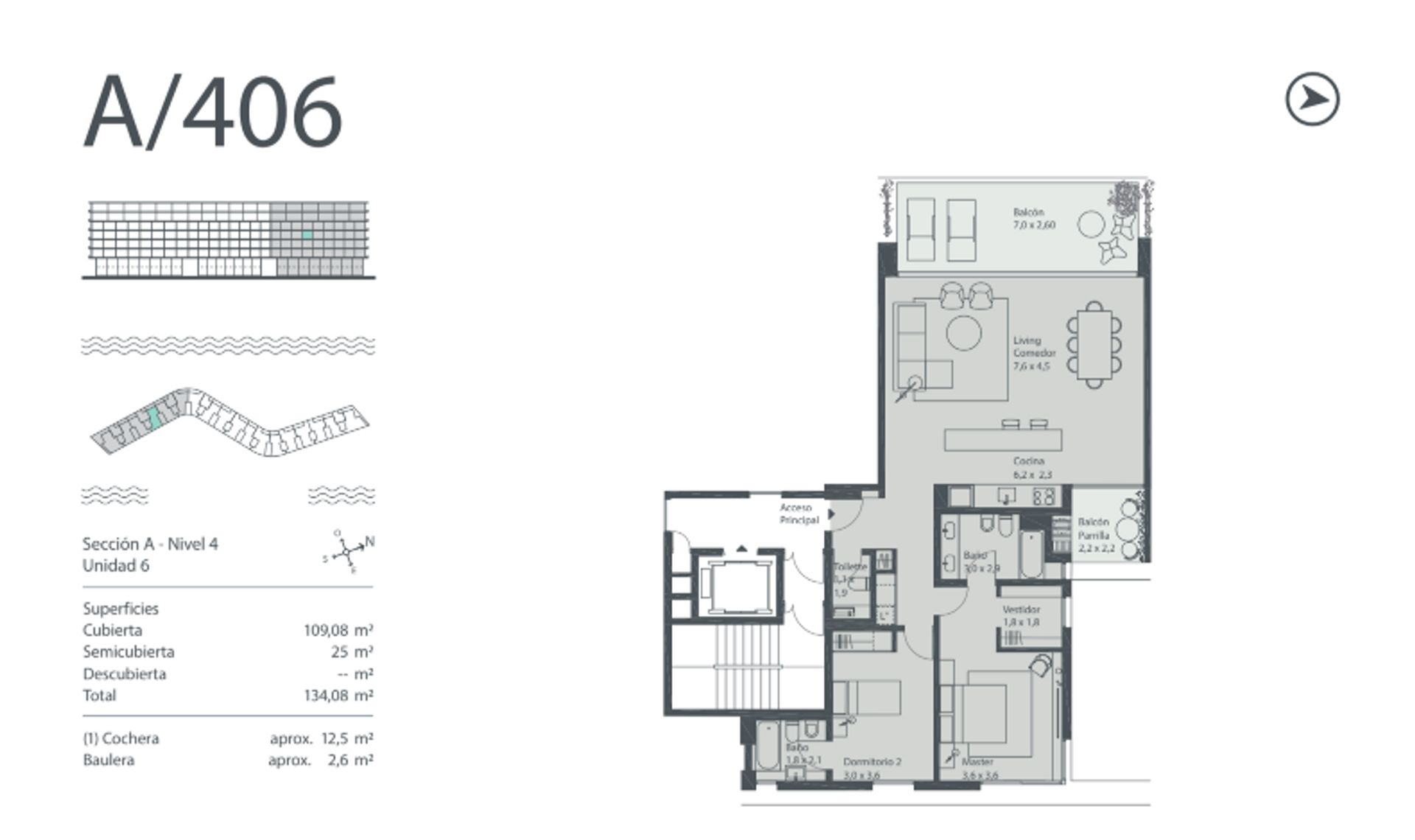 La unidad cuenta con una cochera de 12,5 m² y una baulera de 2,6 m², asegurando espacio de estacionamiento y almacenamiento sin comprometer el diseño interior. El departamento se mantiene en excelente estado de conservación, listo para su entrega en diciembre de 2024.