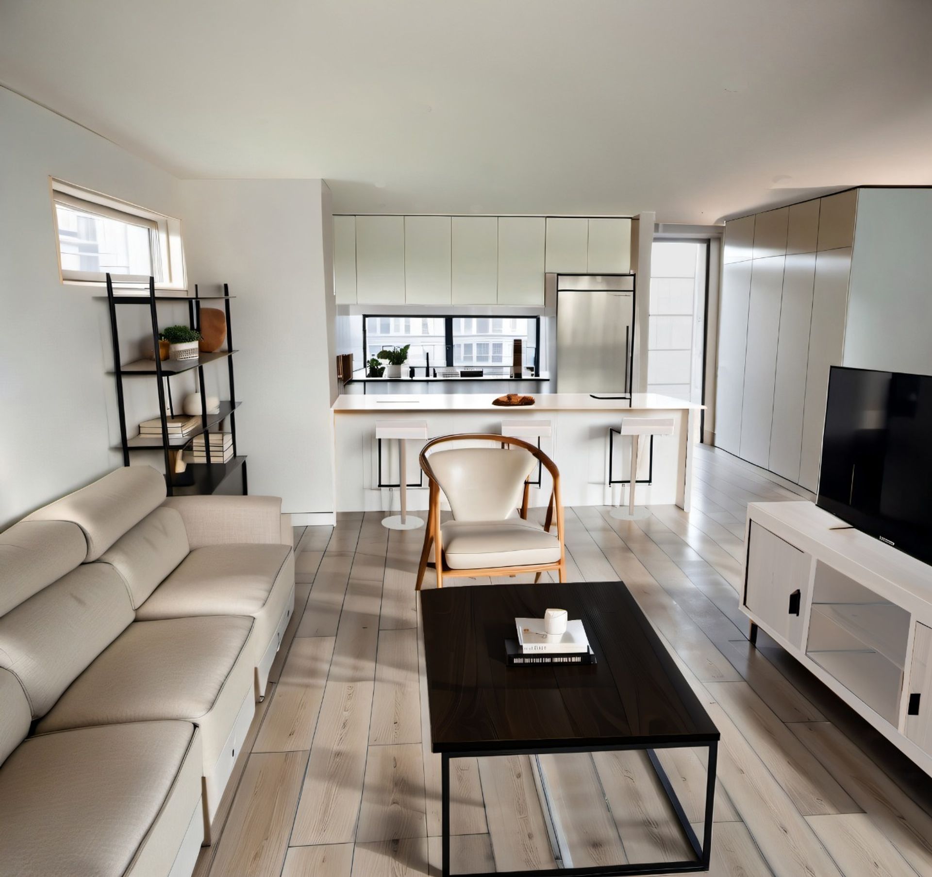 La cocina, equipada con alacena y mueble bajo de melamina, dispone de espacio para lavavajillas y lavarropas, y se integra con una barra o mesa que conecta al living. El salón se abre al balcón mediante puerta ventana doble, creando un ambiente luminoso y fluido.