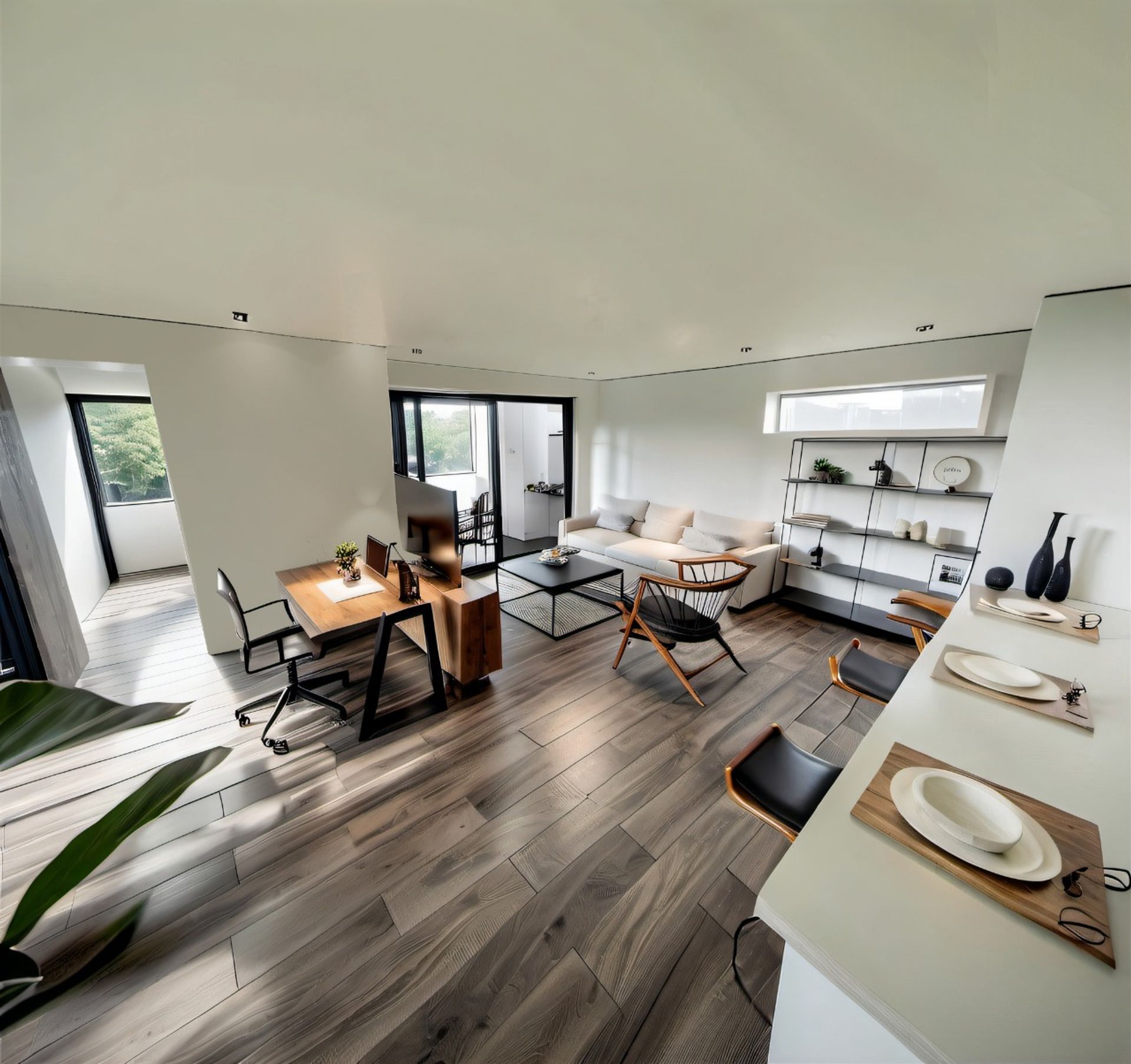 Los pisos de porcelanato línea ILVA, las aberturas de PVC con DVH y mosquiteros, así como las mesadas de cuarzo, aportan elegancia y durabilidad. Las griferías FV, los artefactos sanitarios Ferrum y las bañeras ovales Roca complementan la estética contemporánea. Las paredes, terminadas en revoque fino a la cal y pintadas en látex blanco, se combinan con revestimientos cerámicos blancos esmaltados en los baños.