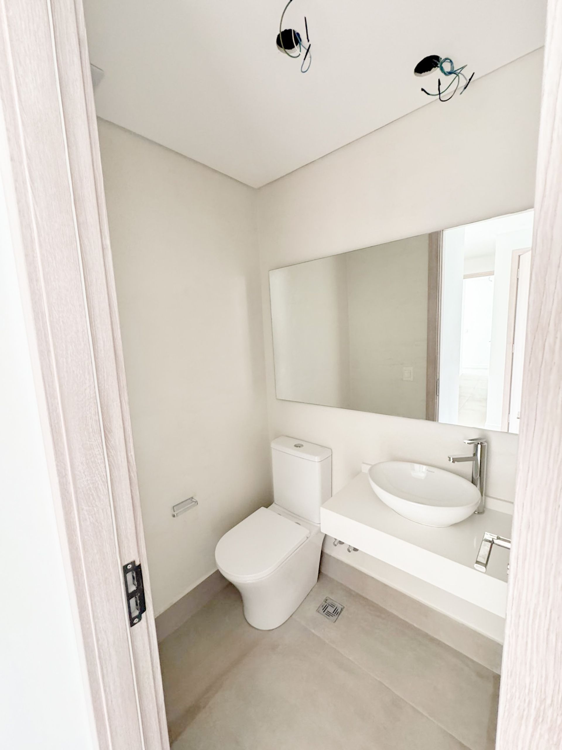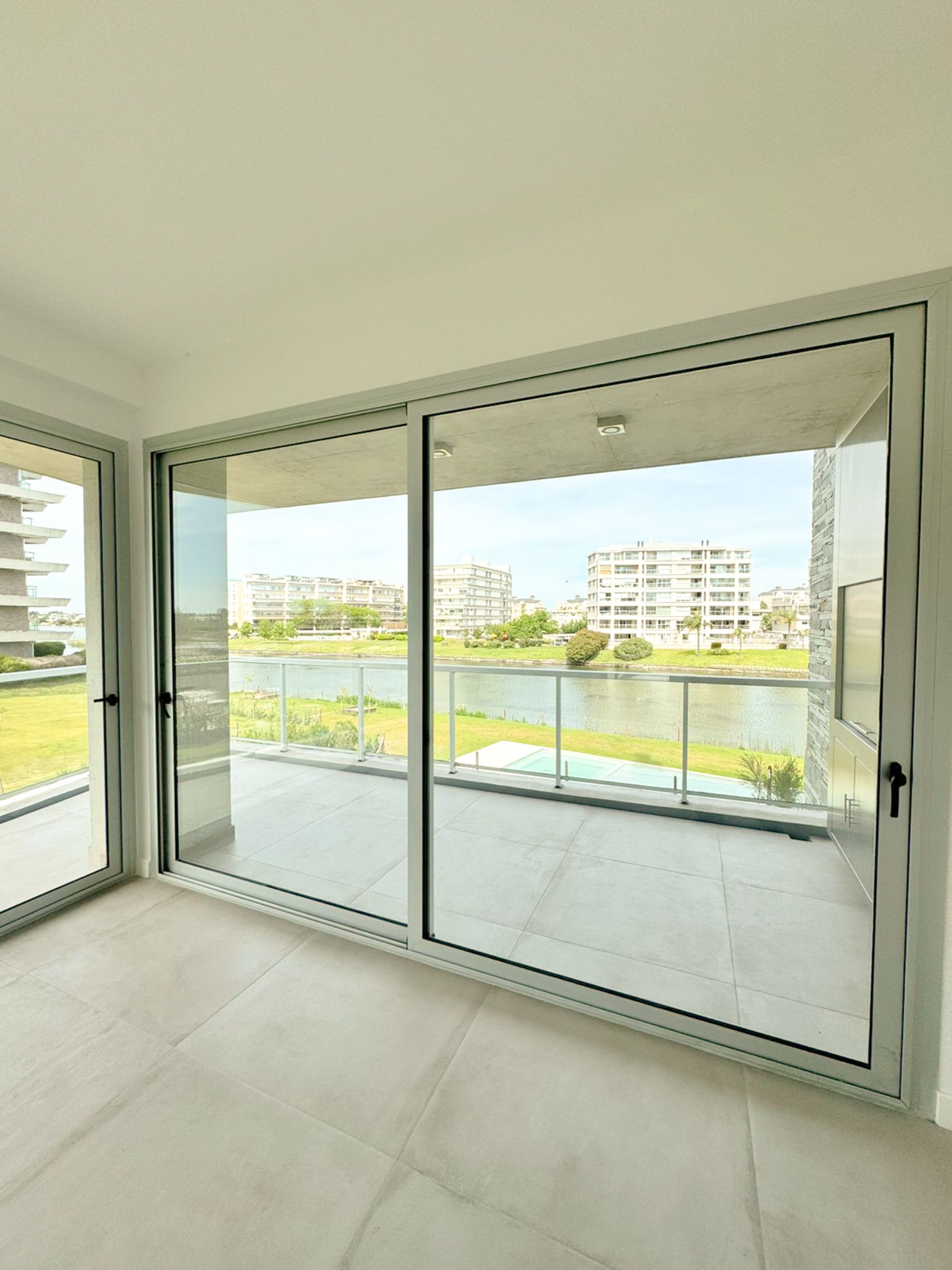 El amplio living cuenta con ventanas de gran tamaño que brindan una vista panorámica al lago. La cocina, totalmente equipada, se abre a un balcón adyacente al comedor, ideal para disfrutar de la luz natural y el aire fresco. Un segundo balcón en forma de “L” dispone de una parrilla y ofrece una vista igualmente cautivadora al agua. Además, el salón incluye un toilette de acceso.