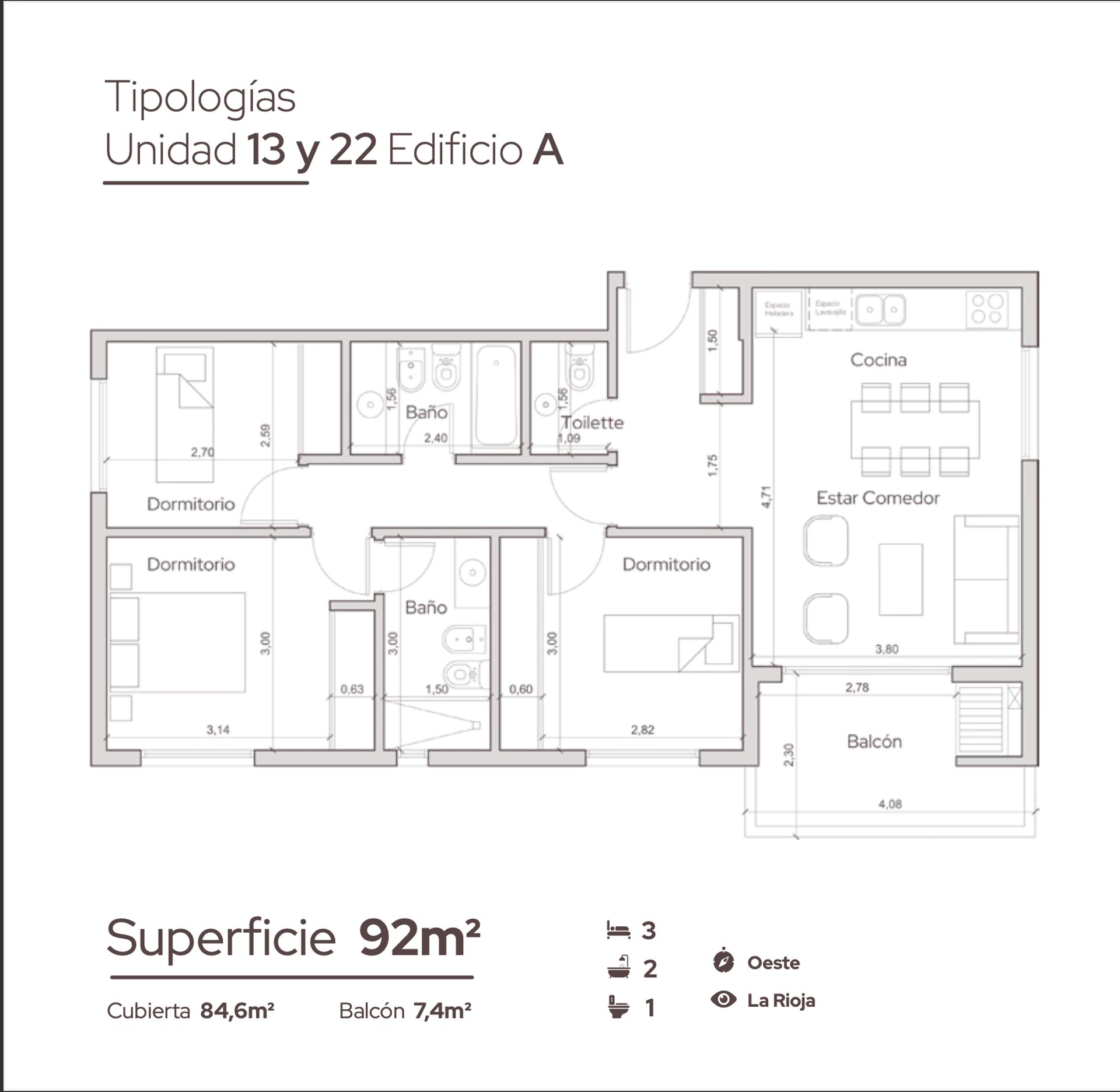 Departamento de 3 dormitorios ubicado en el complejo Pacheco Central, en la zona de General Pacheco, Buenos Aires. Se trata de una unidad de 92 m² construidos, de los cuales 85 m² son cubiertos y 7 m² semicubiertos, situada en el segundo piso de un edificio de cuatro plantas. La vivienda dispone de tres habitaciones, entre ellas un dormitorio principal con baño en suite, balcón y parrilla, además de dos baños completos y un toilette adicional. El espacio de estar incluye un amplio living-comedor y una cocina equipada, con acceso a un balcón que brinda luz natural y vistas agradables.