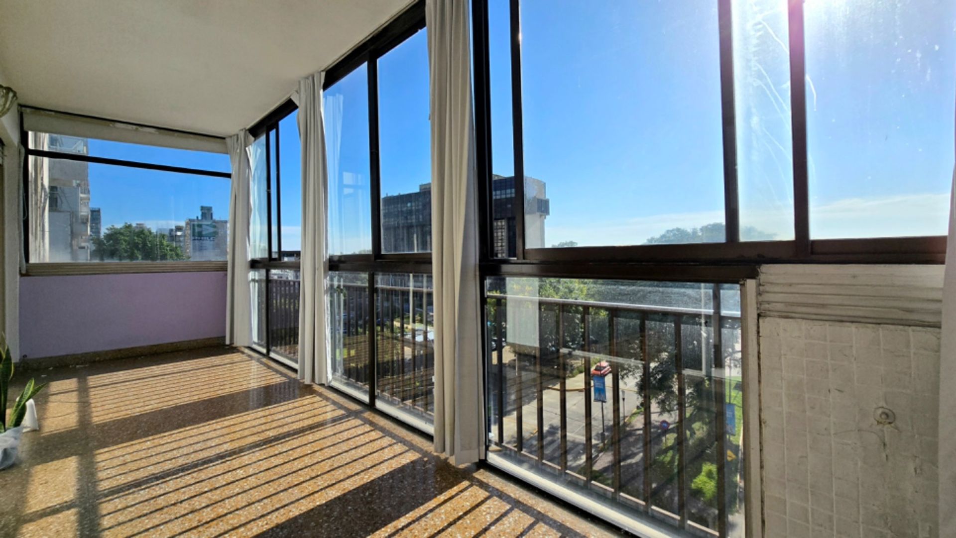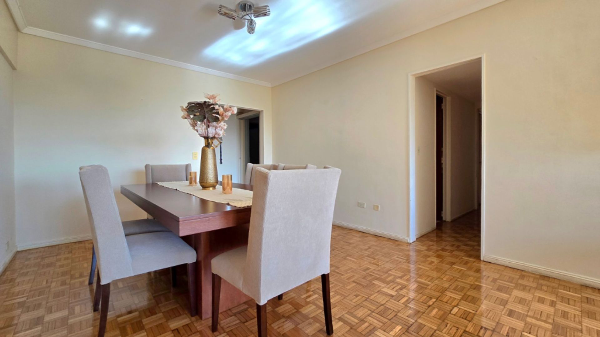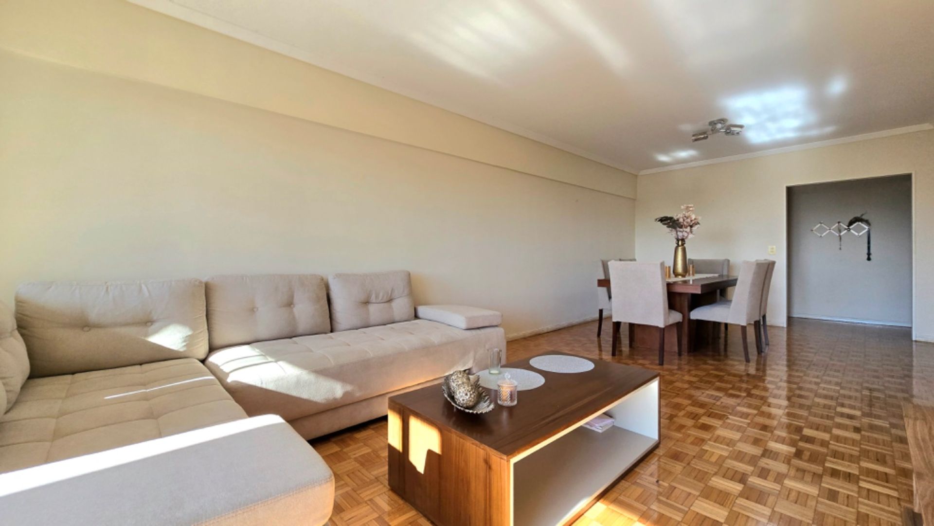 El interior presenta un amplio living y comedor, tres dormitorios frontales con acceso a balcones corridos, dos baños completos, cocina independiente a gas de gran espacio, toilette adicional, dependencia de servicio amplia con placard y lavadero en el balcón lateral. La vivienda dispone de aire acondicionado en tres zonas, calefacción por losa radiante central y agua caliente central, garantizando confort en todas las estaciones.