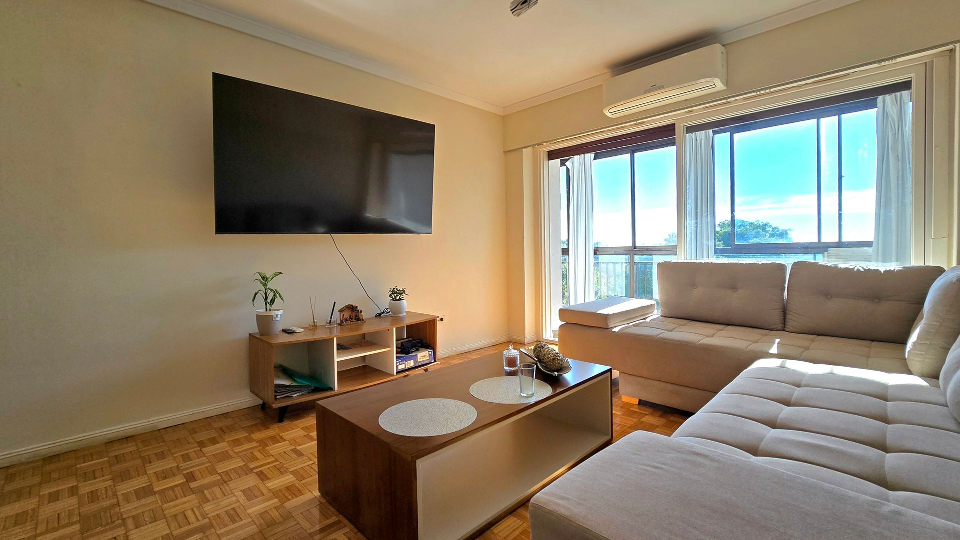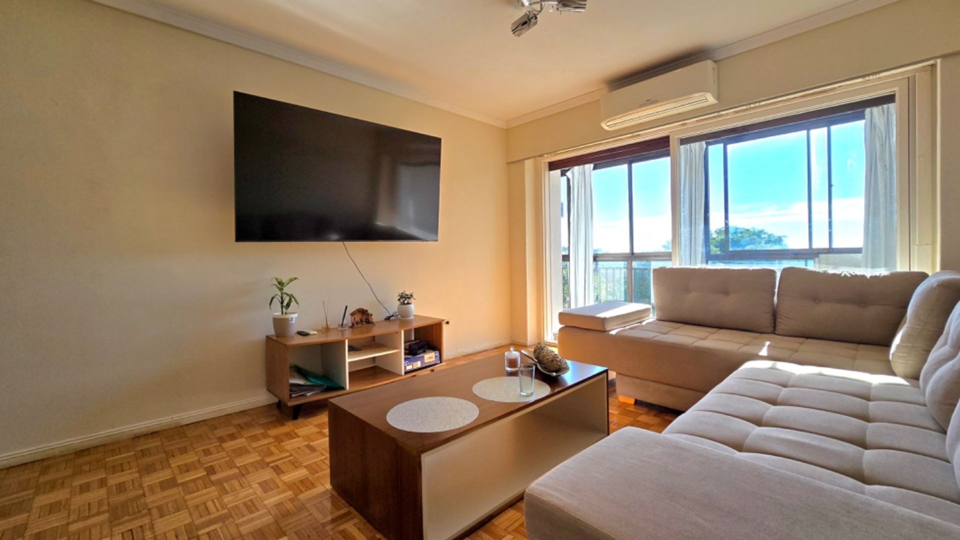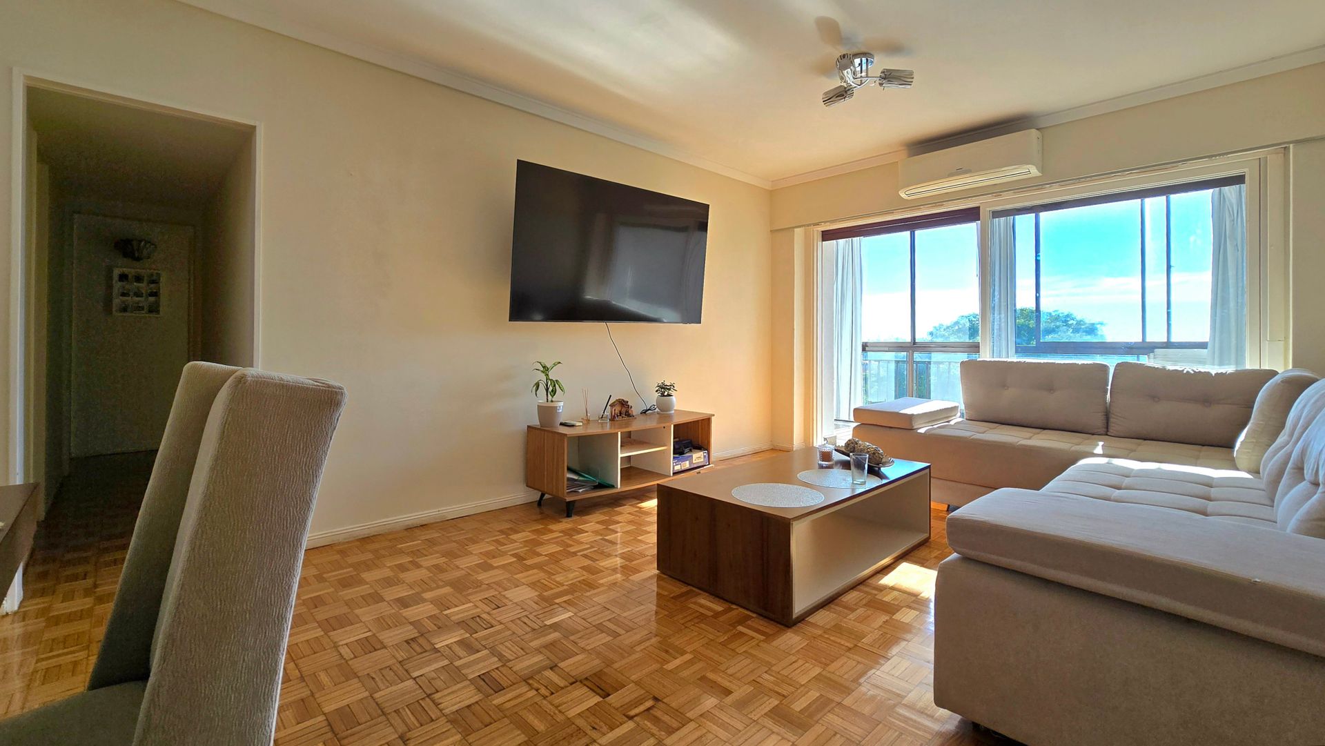 El interior presenta un amplio living y comedor, tres dormitorios frontales con acceso a balcones corridos, dos baños completos, cocina independiente a gas de gran espacio, toilette adicional, dependencia de servicio amplia con placard y lavadero en el balcón lateral. La vivienda dispone de aire acondicionado en tres zonas, calefacción por losa radiante central y agua caliente central, garantizando confort en todas las estaciones.