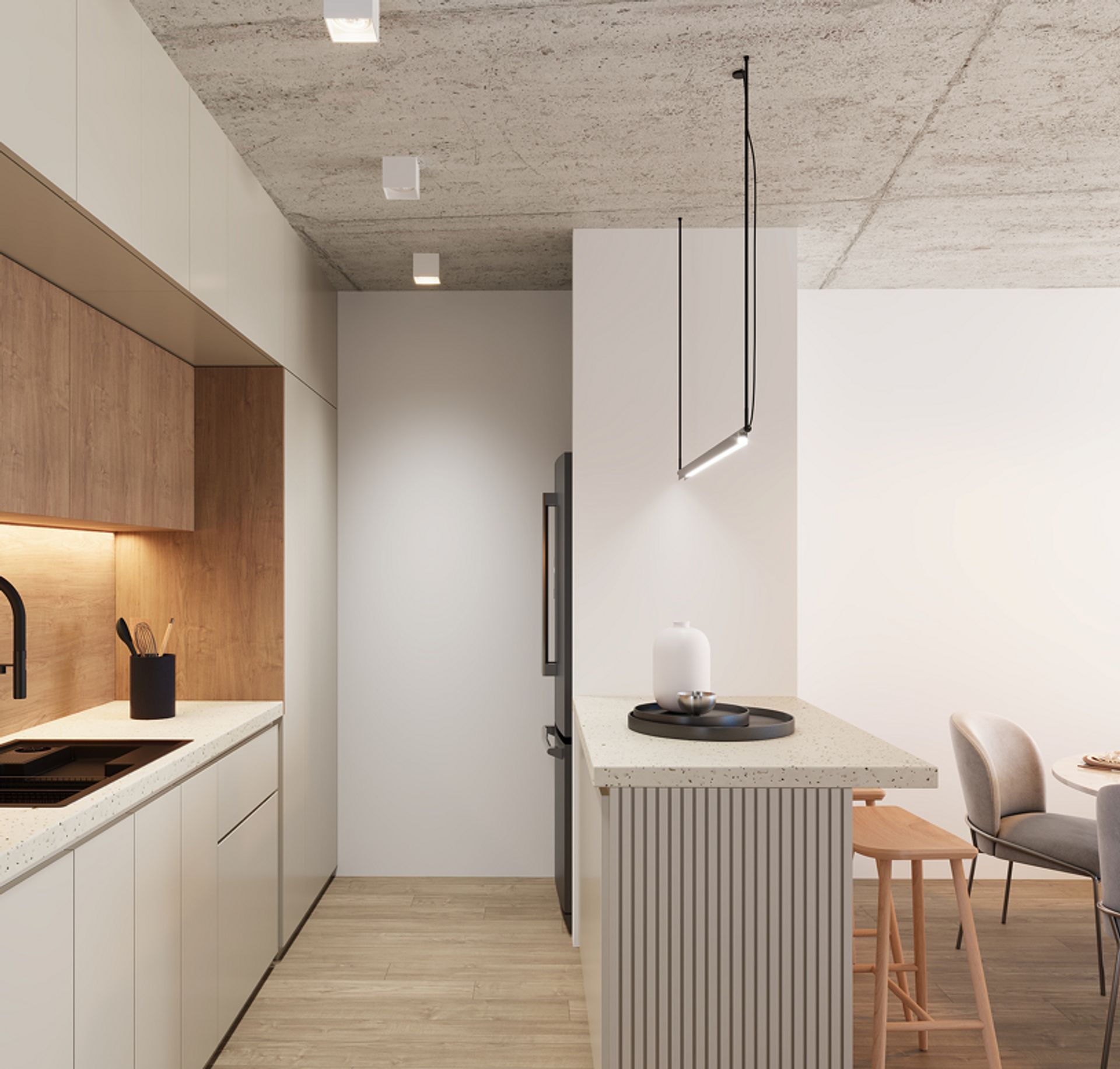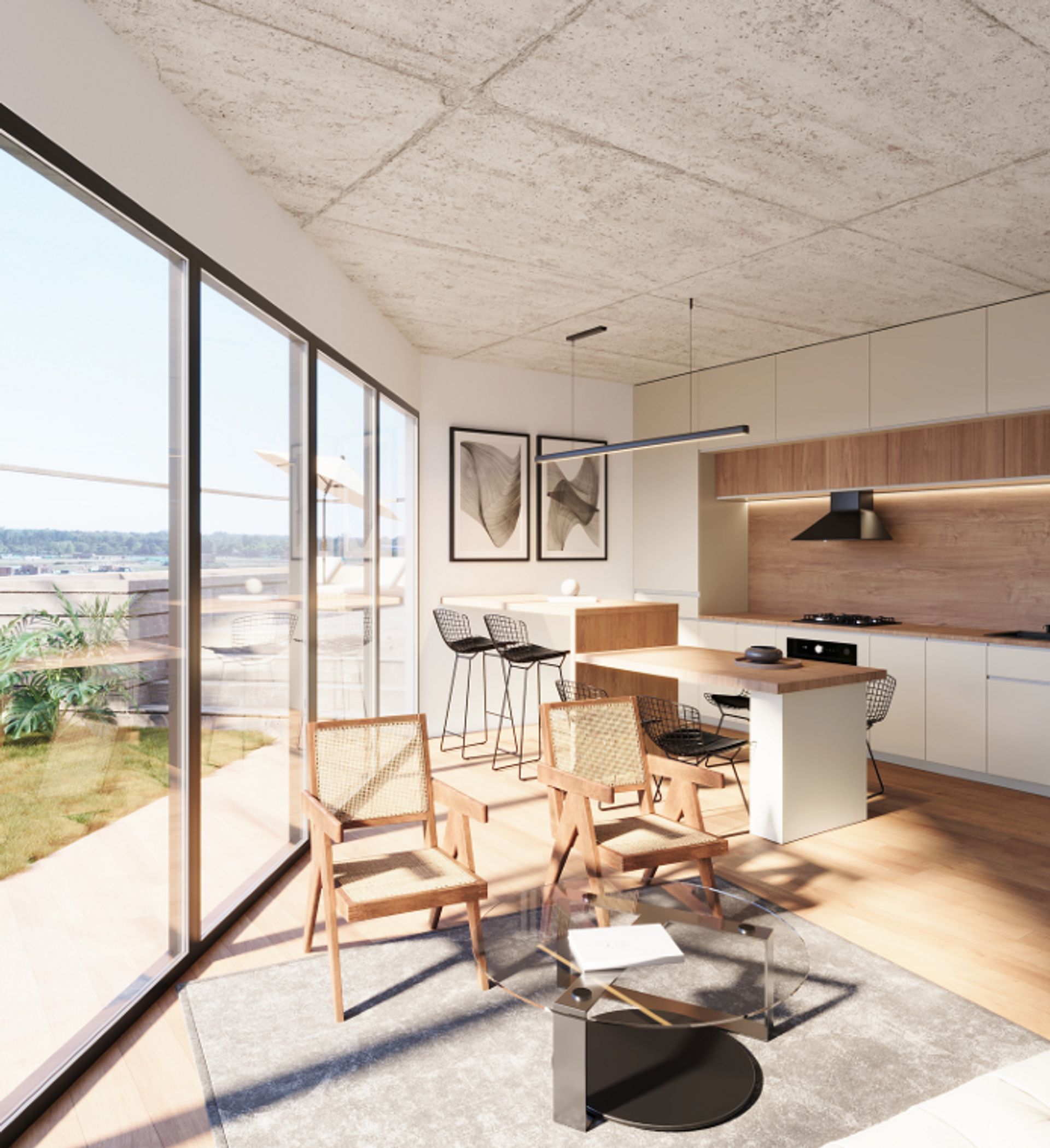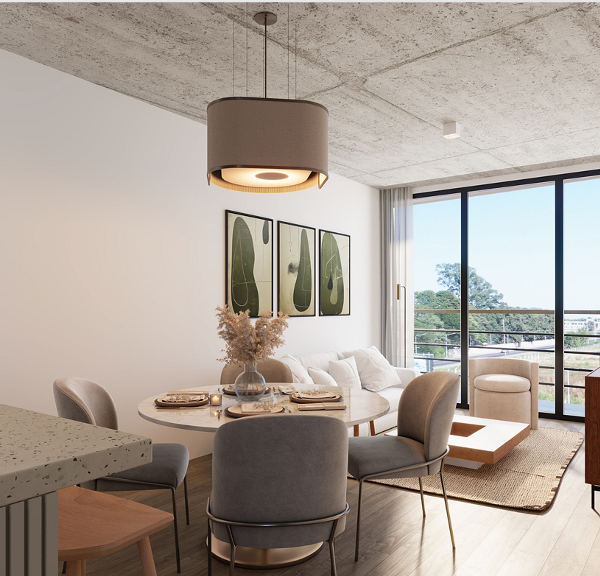 El diseño del edificio combina residencias modernas con un sector comercial, creando un espacio que responde a las necesidades de una comunidad en constante crecimiento. Los departamentos de 1, 2 y 3 ambientes están diseñados con líneas limpias y materiales de alta calidad, ofreciendo opciones con balcones privados o terrazas verdes que brindan un refugio al aire libre.