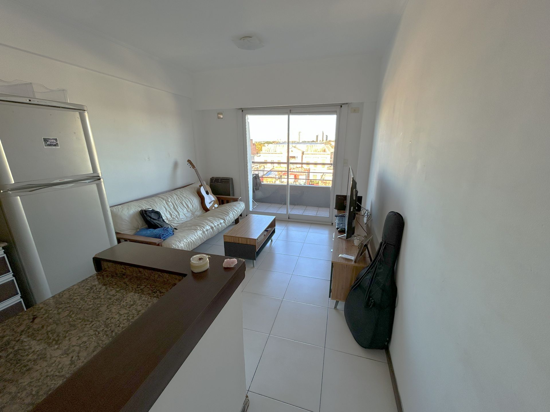 El interior combina funcionalidad y comodidad: un espacio de estar y comedor con salida al balcón, una cocina integrada que facilita la preparación de comidas, un dormitorio con placard y un baño completo con acabados modernos. La distribución permite una circulación fluida y un ambiente acogedor.