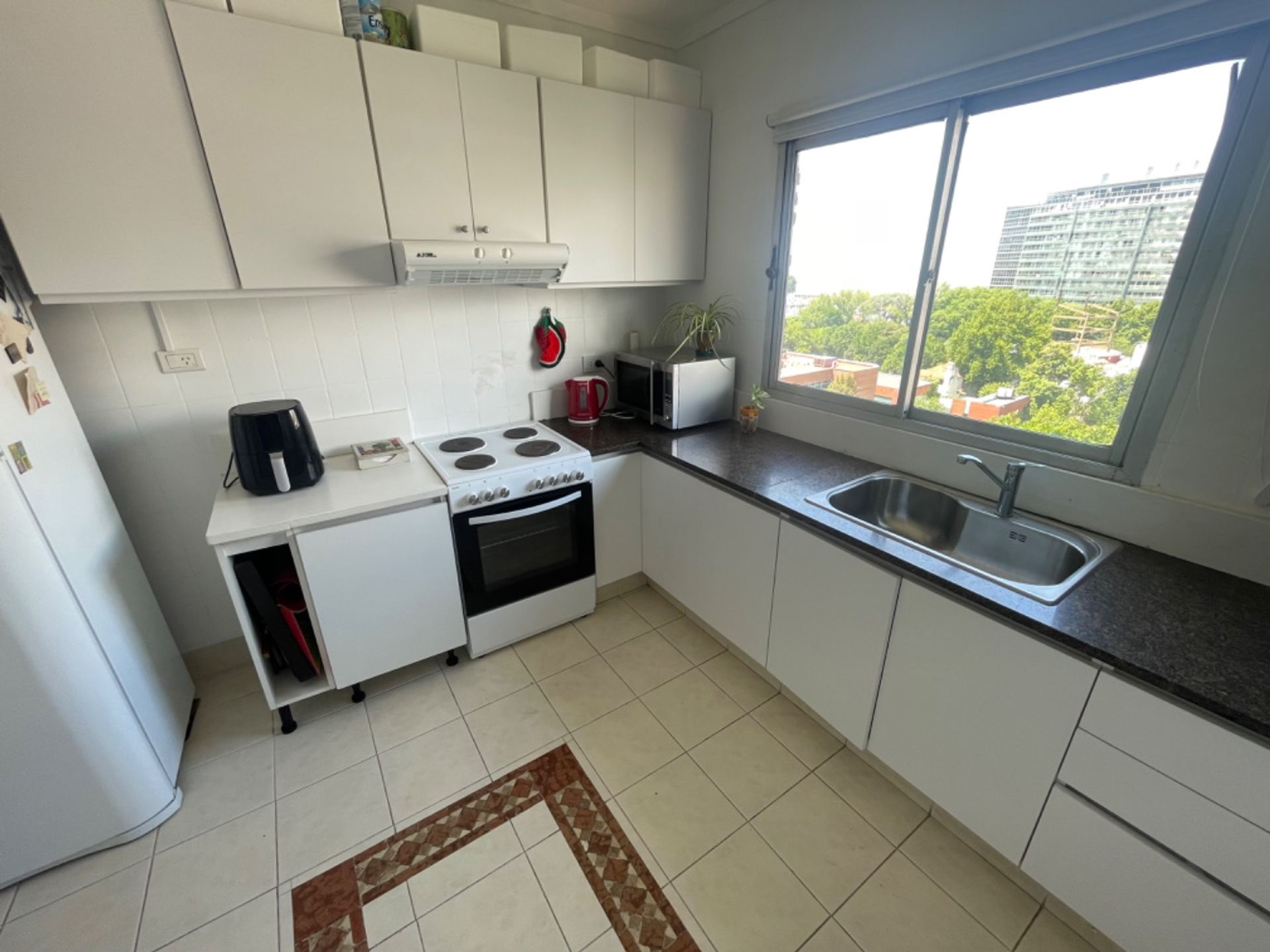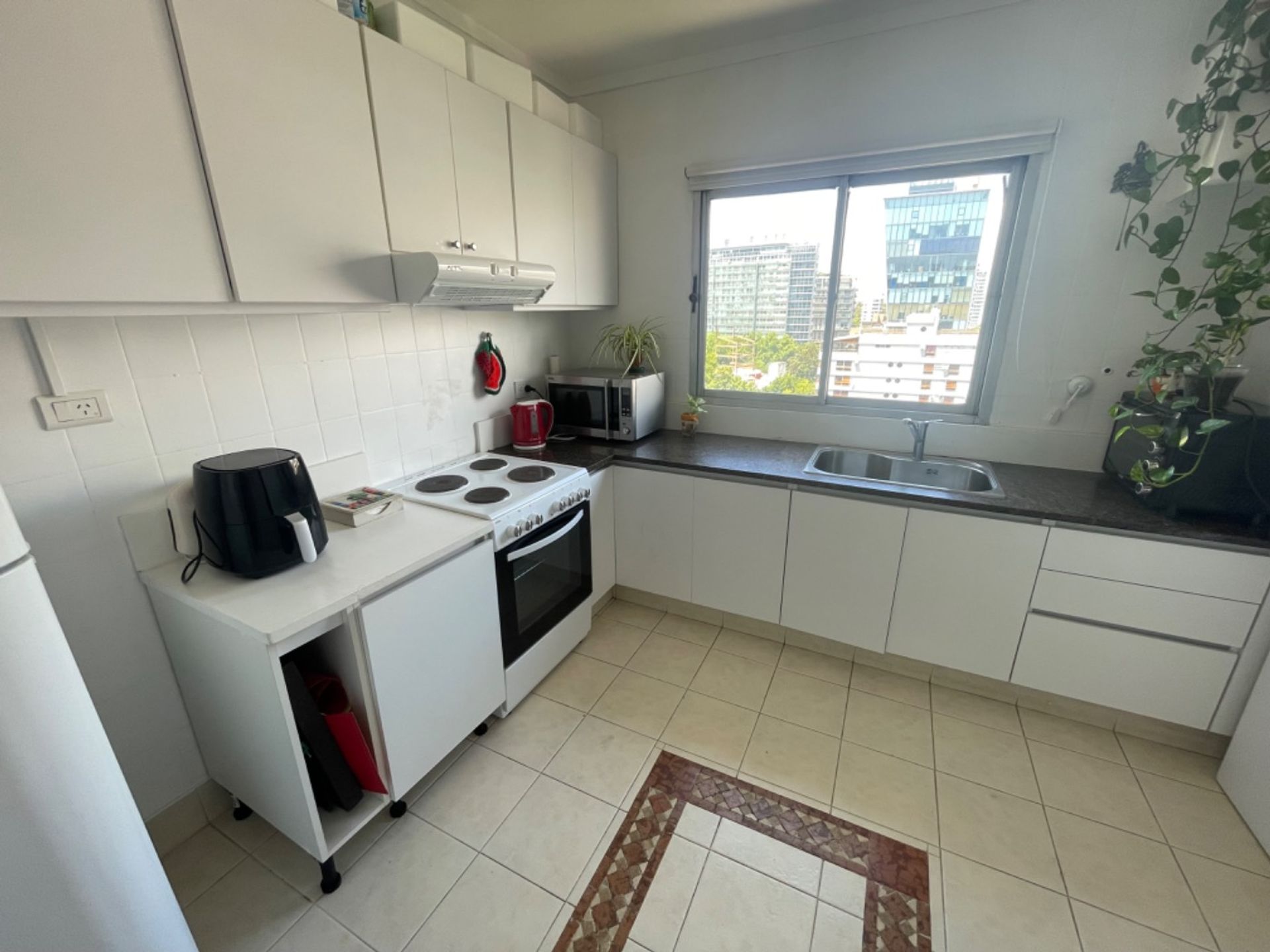 Al ingresar, un pasillo amplio conduce a una cocina moderna y completamente equipada, con amplios espacios de trabajo, circulación fluida y un gran ventanal que inunda el ambiente de luz natural y ofrece una vista panorámica del puerto de Olivos.