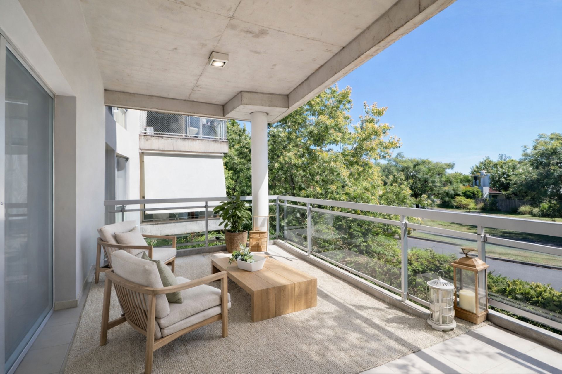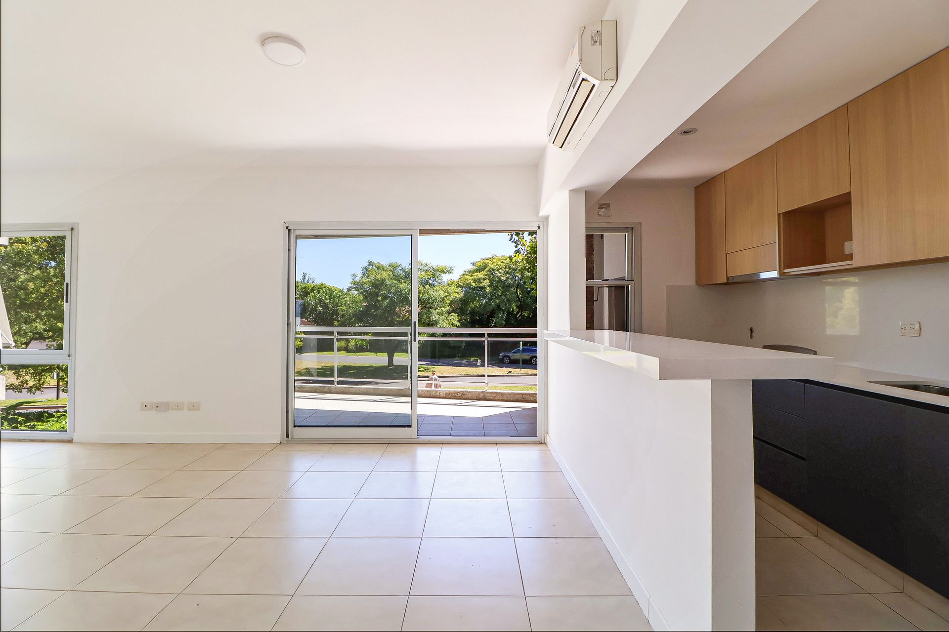 El living comedor es amplio y luminoso, con salida a un gran balcón aterrazado que cuenta con parrilla y ofrece vista abierta a los espacios verdes del sector, ideal para disfrutar durante todo el año. La cocina, completamente renovada, tiene diseño moderno, barra desayunadora y conexión visual con el área social. En el mismo nivel se ubica un lavadero independiente, funcional y bien resuelto.
