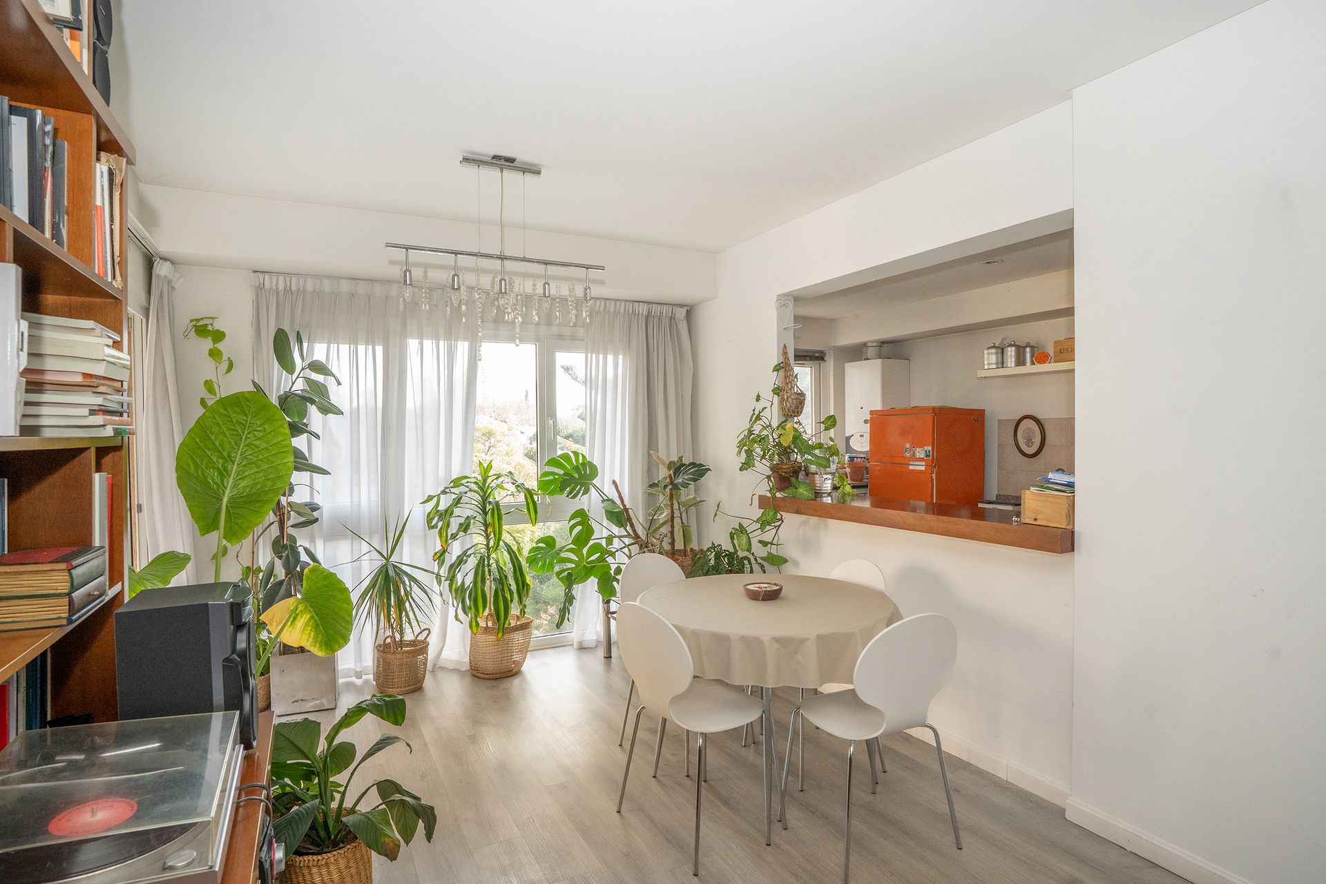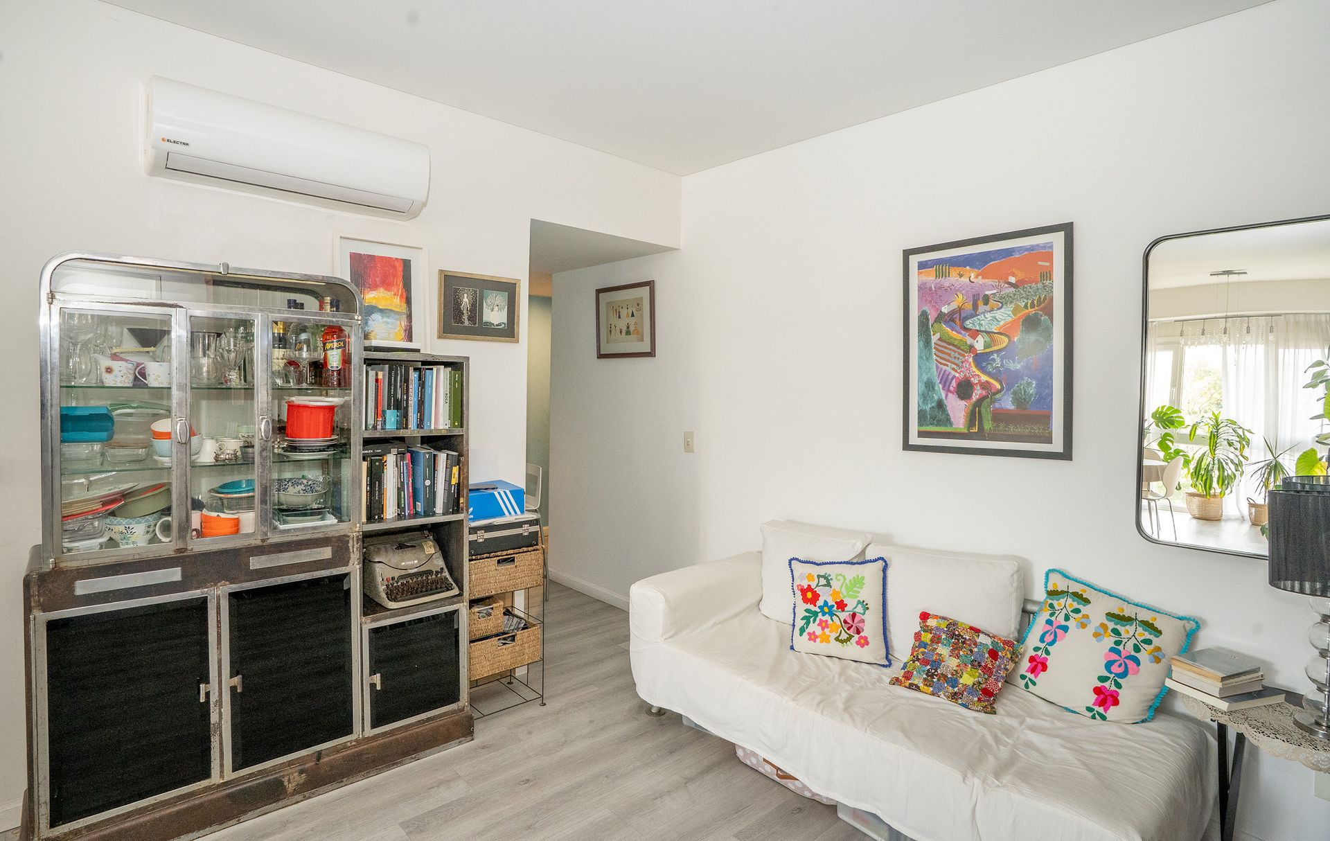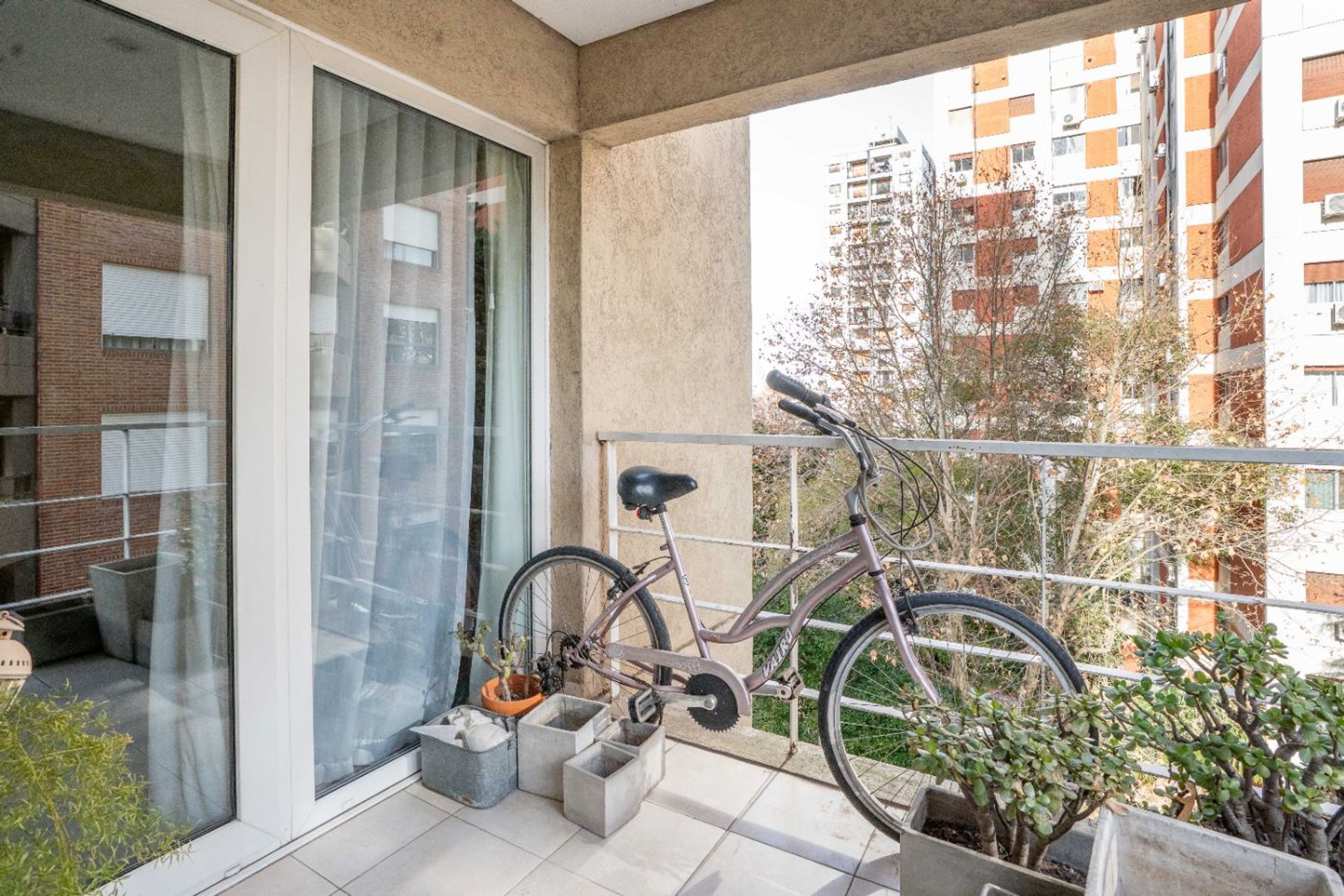 El amplio estar se abre al balcón en esquina, con cocina integrada equipada con barra y conexión para lavarropas. En el mismo nivel se ubica un toilette. El dormitorio dispone de ventanal que da al balcón, un pequeño vestidor y baño completo en suite.