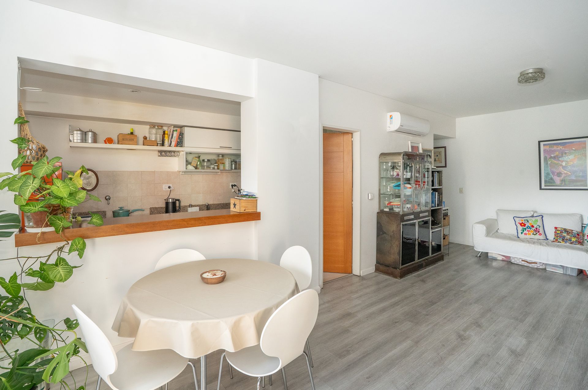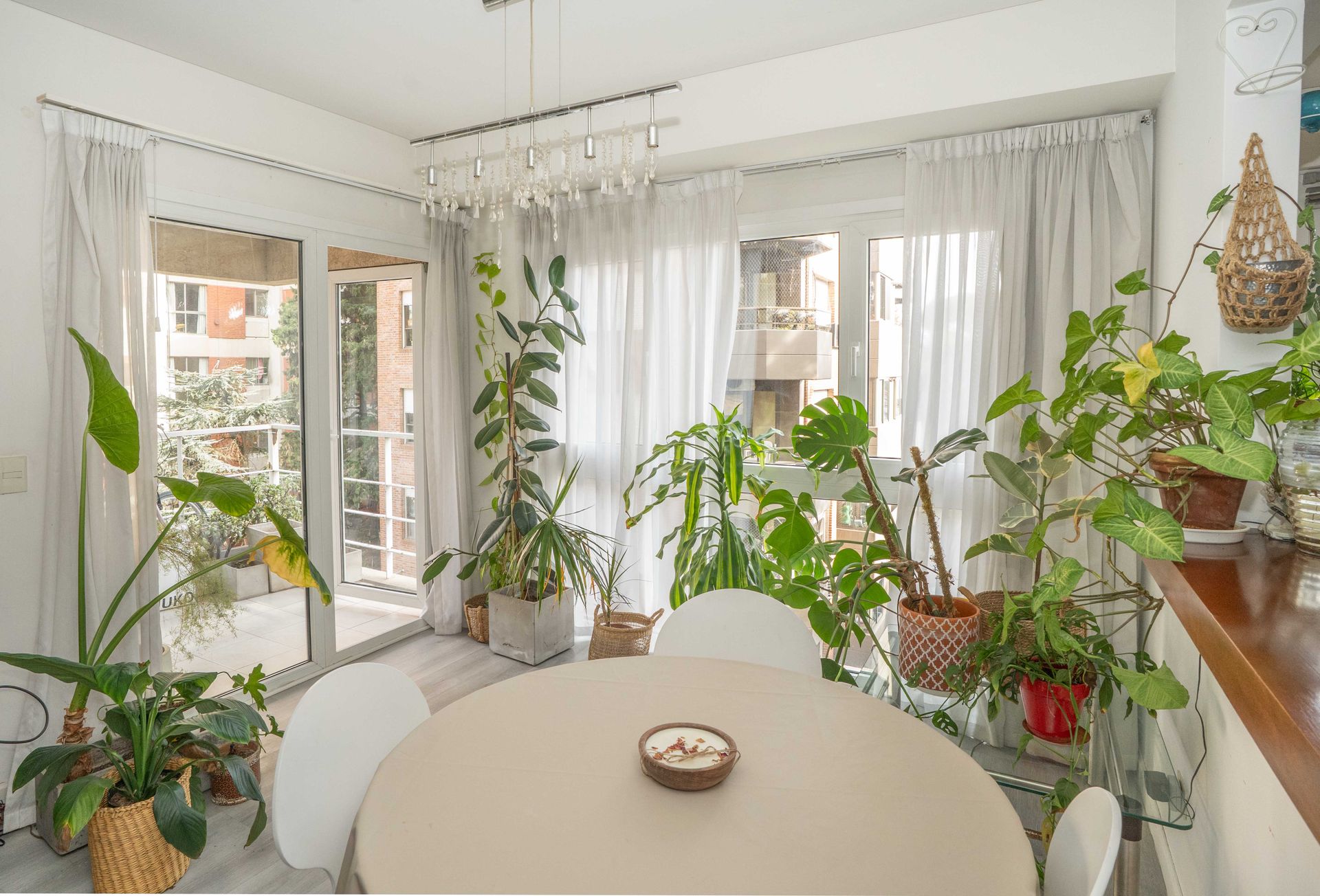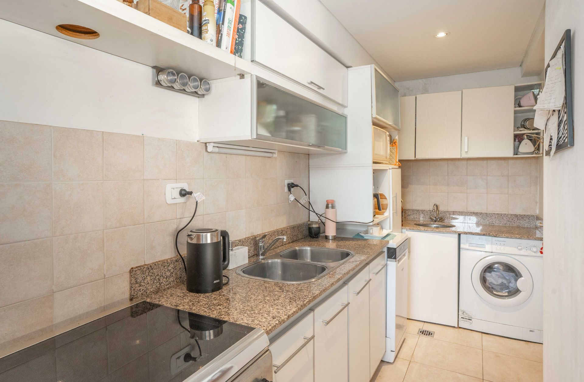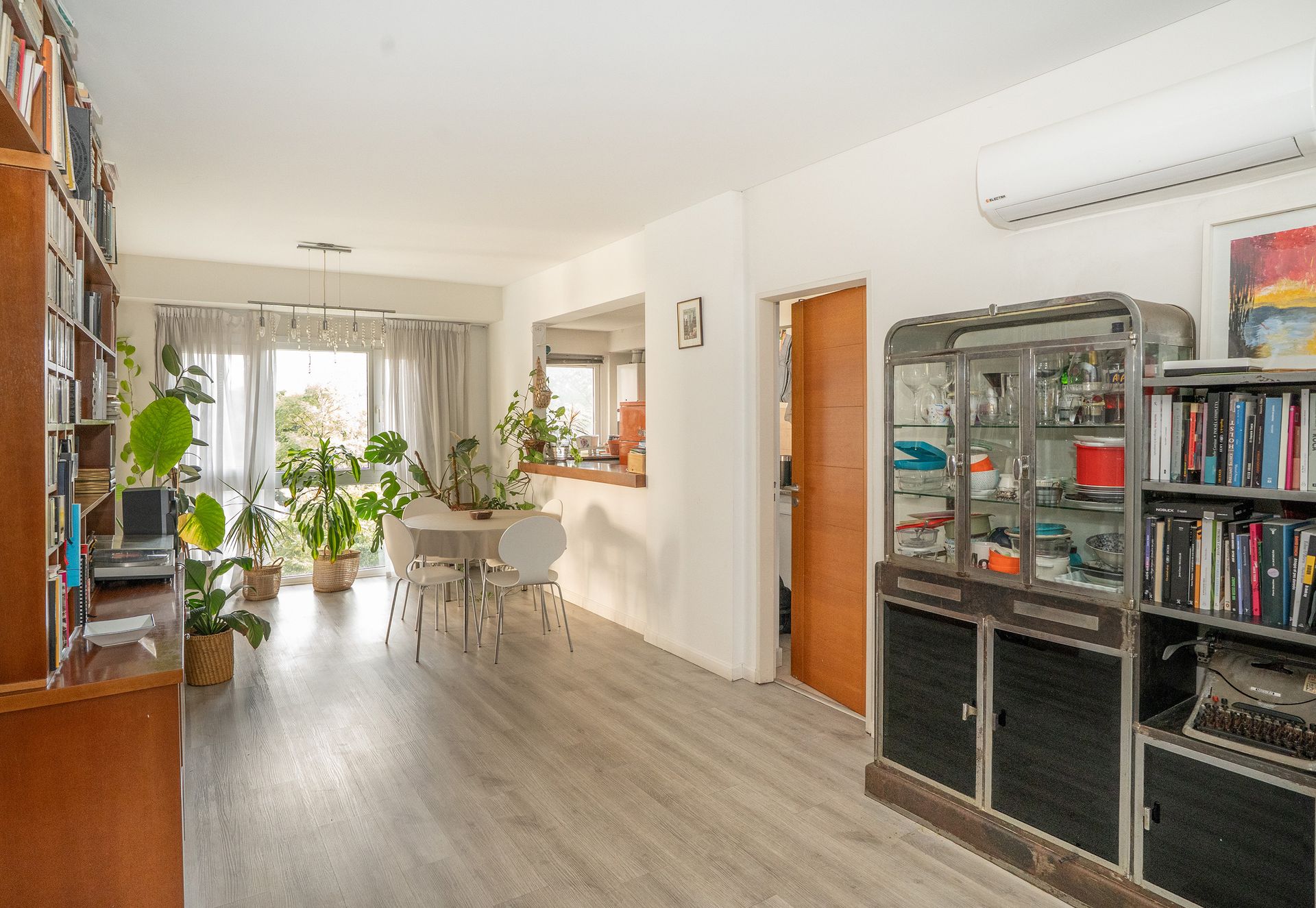 El amplio estar se abre al balcón en esquina, con cocina integrada equipada con barra y conexión para lavarropas. En el mismo nivel se ubica un toilette. El dormitorio dispone de ventanal que da al balcón, un pequeño vestidor y baño completo en suite.