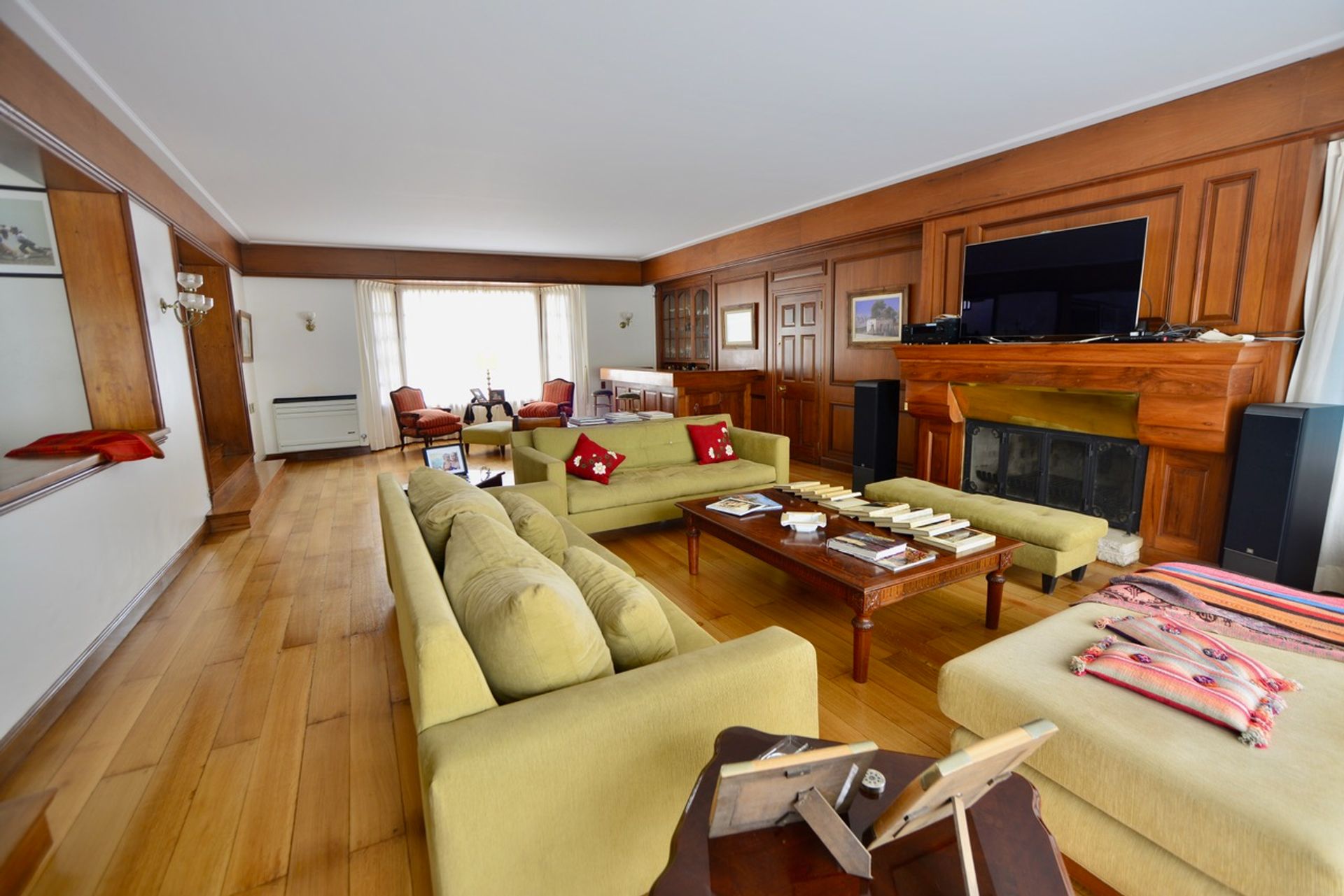 El ingreso principal cuenta con portón eléctrico y un espacio semicubierto para dos autos, además de una amplia entrada adoquinada que permite estacionar hasta seis vehículos. La recepción conduce a un amplio living con un distinguido bar completo, hogar de madera y bronce, y a un salón-comedor en desnivel que ofrece vistas al jardín y abundante luz natural.