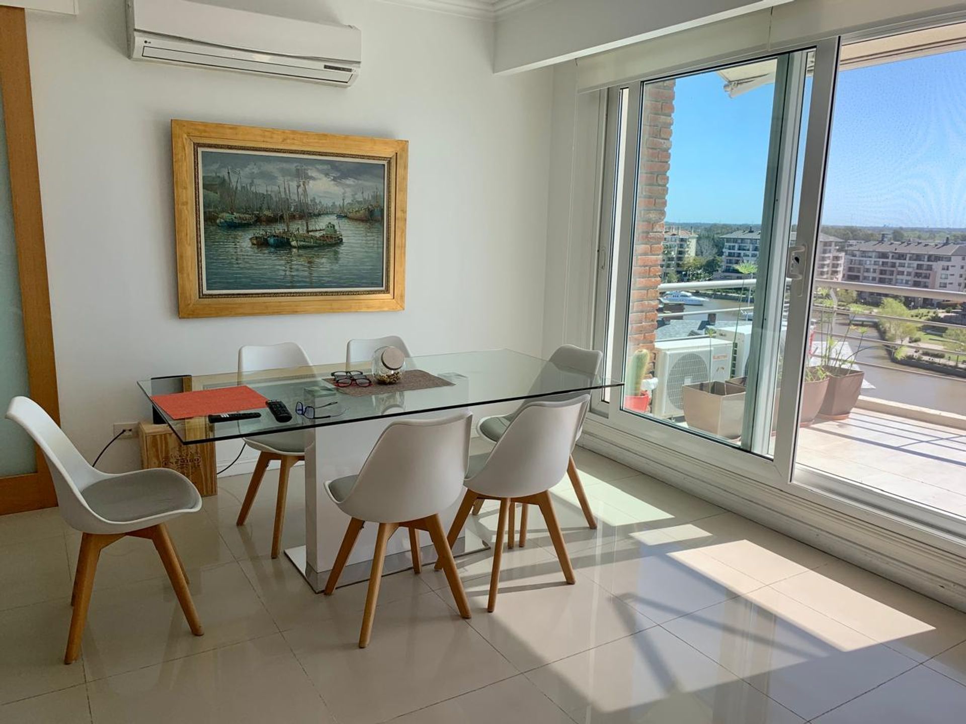 El amplio living comedor, con ventanales de piso a techo, se abre a una terraza balcón equipada con parrilla, perfecta para disfrutar de los atardeceres sobre el agua. La cocina integrada, con mesada de silestone y barra desayunadora, complementa el espacio de convivencia.