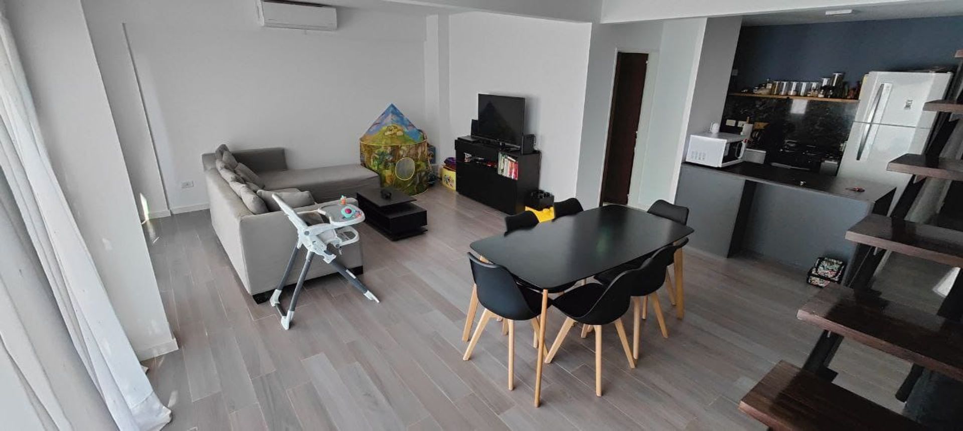 Un balcón corrido orientado al este, ideal para disfrutar de la luz matutina y contar con espacio para parrilla y mobiliario.