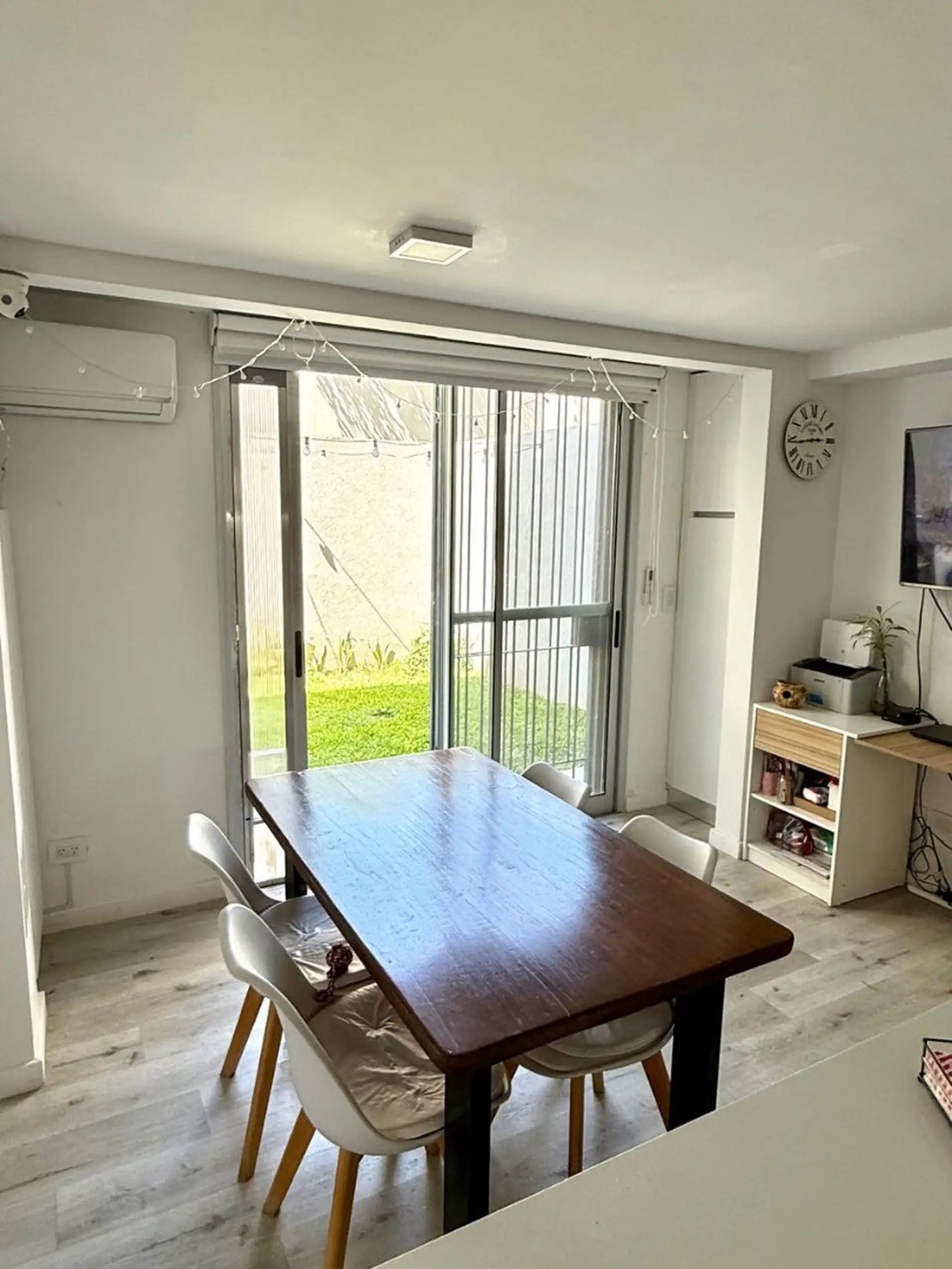 Al entrar, un hall acogedor conduce a un luminoso living-comedor con aire acondicionado split. La cocina, totalmente equipada, cuenta con doble mesada y se integra armoniosamente al área social. Un toilette adicional se encuentra en la planta baja, optimizando la circulación de los ambientes.