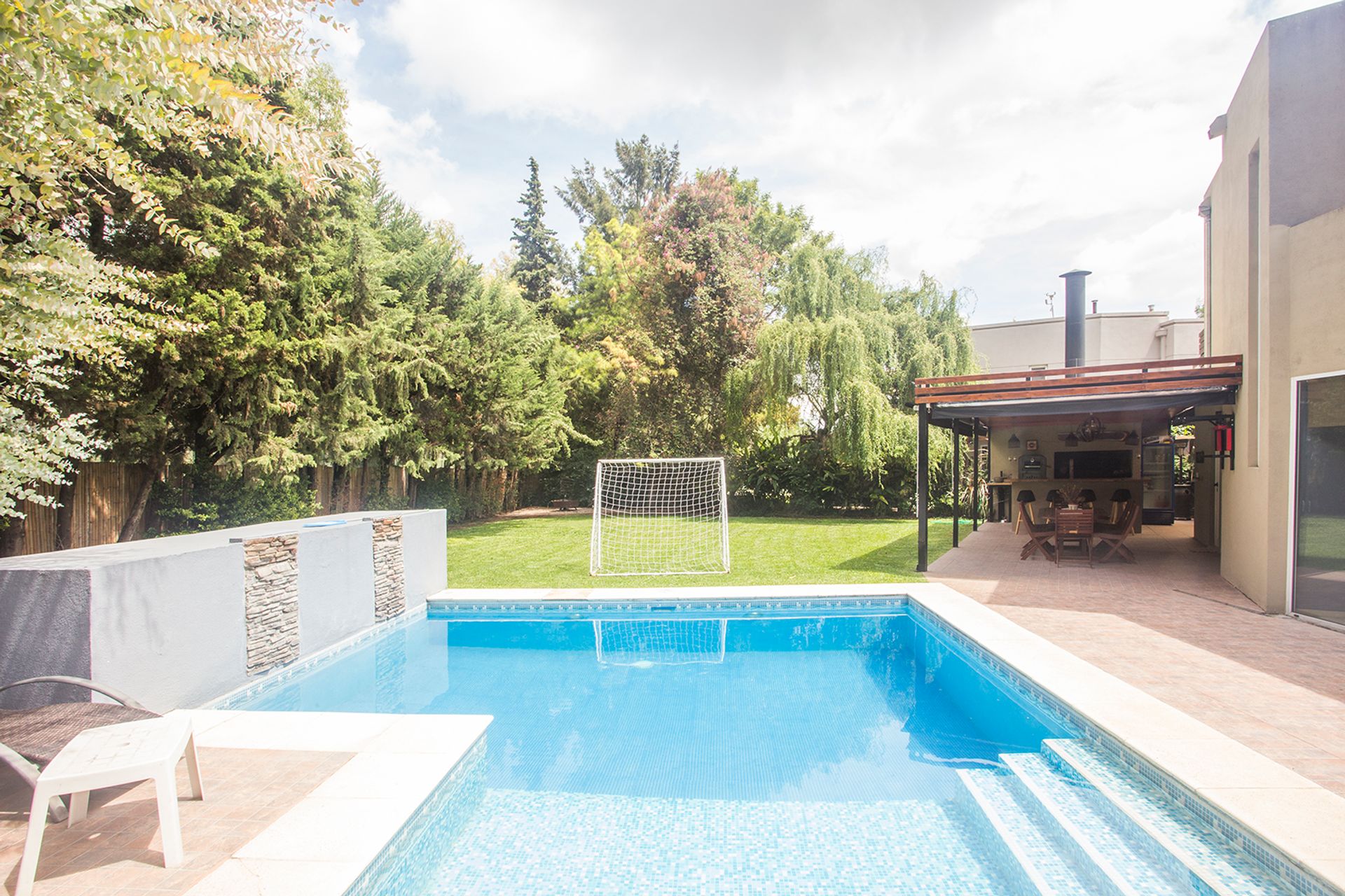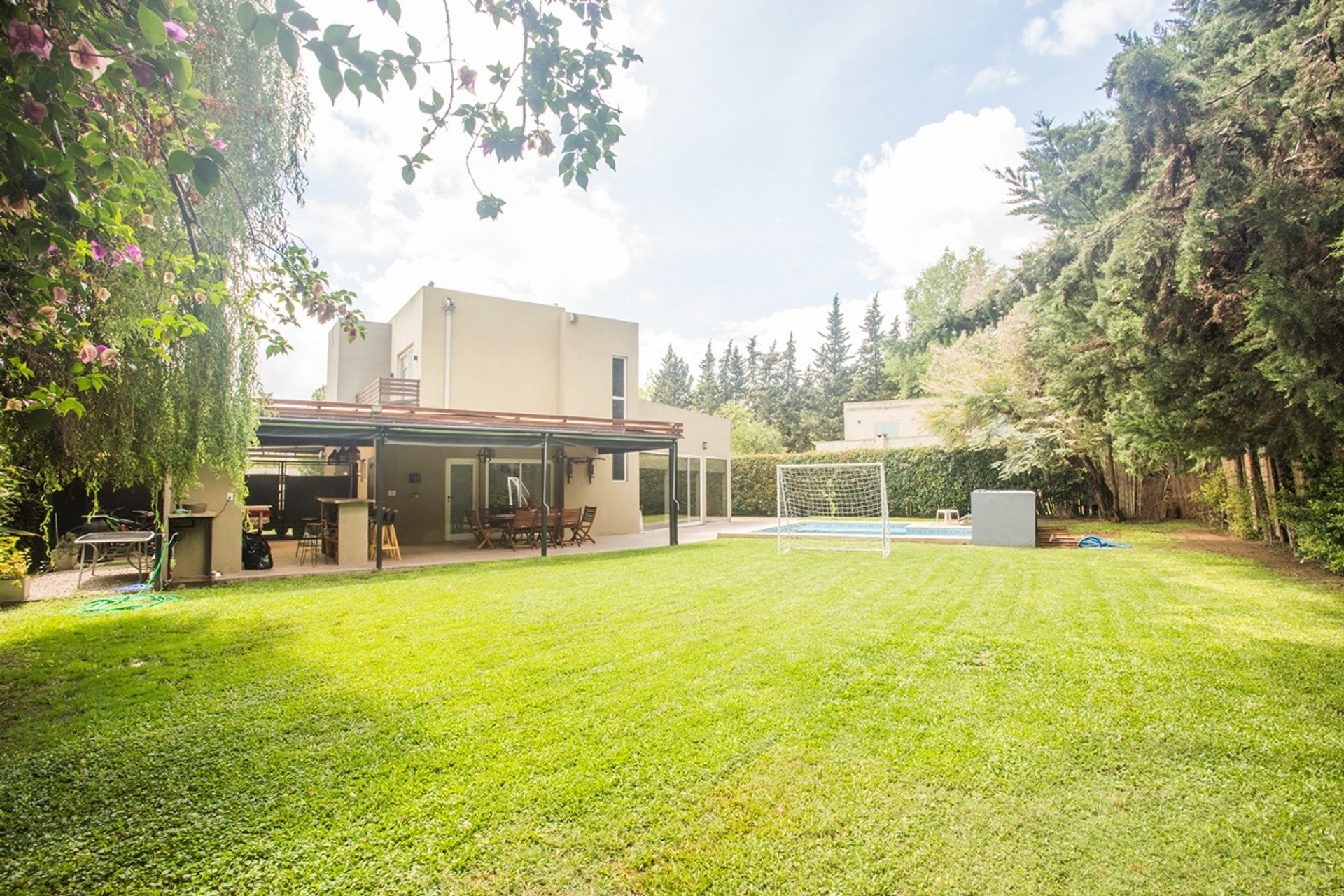 En el exterior destaca un jardín con excelente parquización y una gran galería que incorpora una importante parrilla, ideal para reuniones al aire libre. La piscina revestida con venecitas añade un toque de lujo y frescura al entorno.