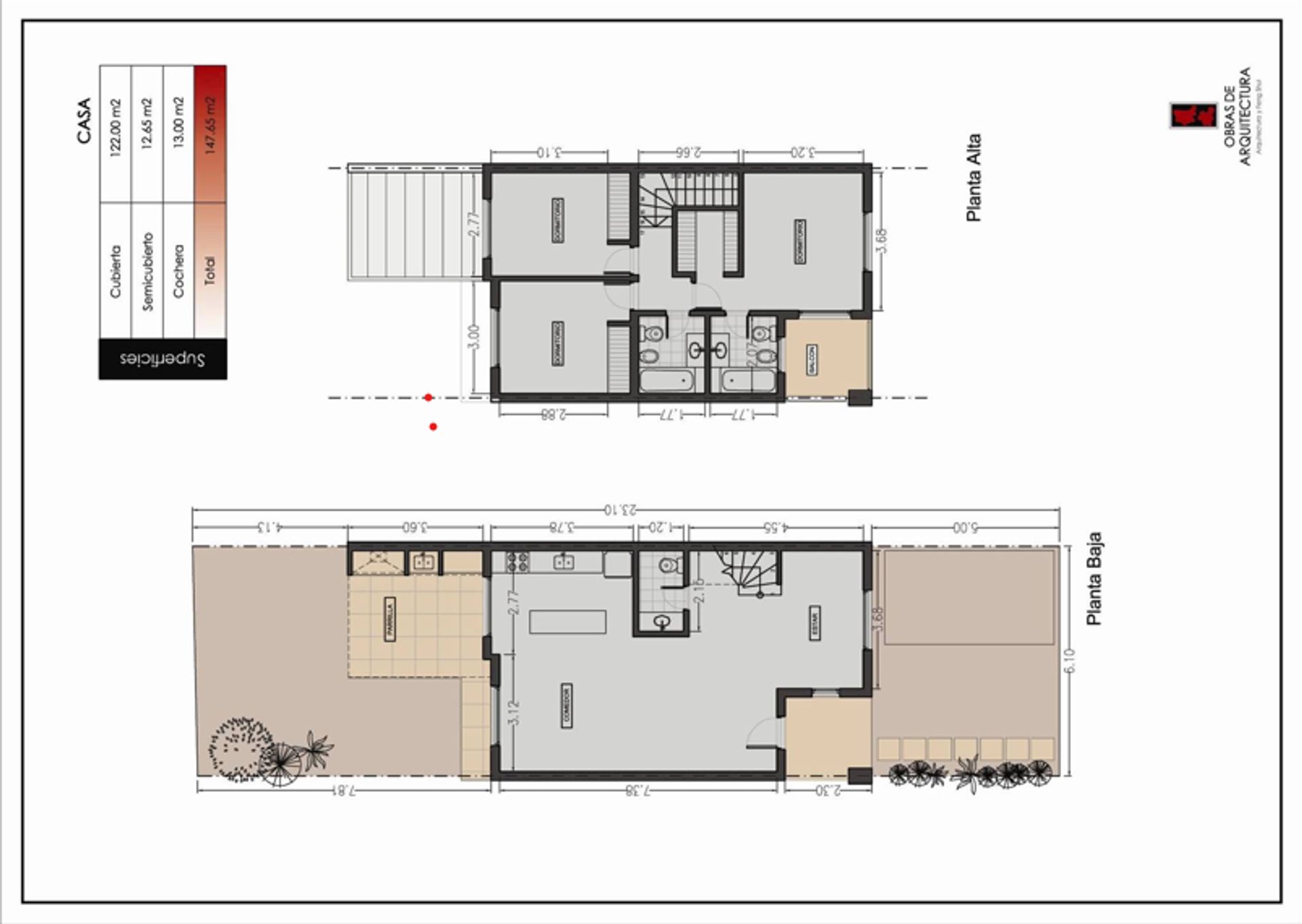 En la planta superior se accede a través de un hall de distribución que conduce al dormitorio principal con suite y vestidor, equipado con aire acondicionado split frío/calor y baño completo con hidromasaje. Un balcón se abre desde el segundo dormitorio, el cual dispone de placard y baño completo. El segundo dormitorio también es una suite con baño propio.