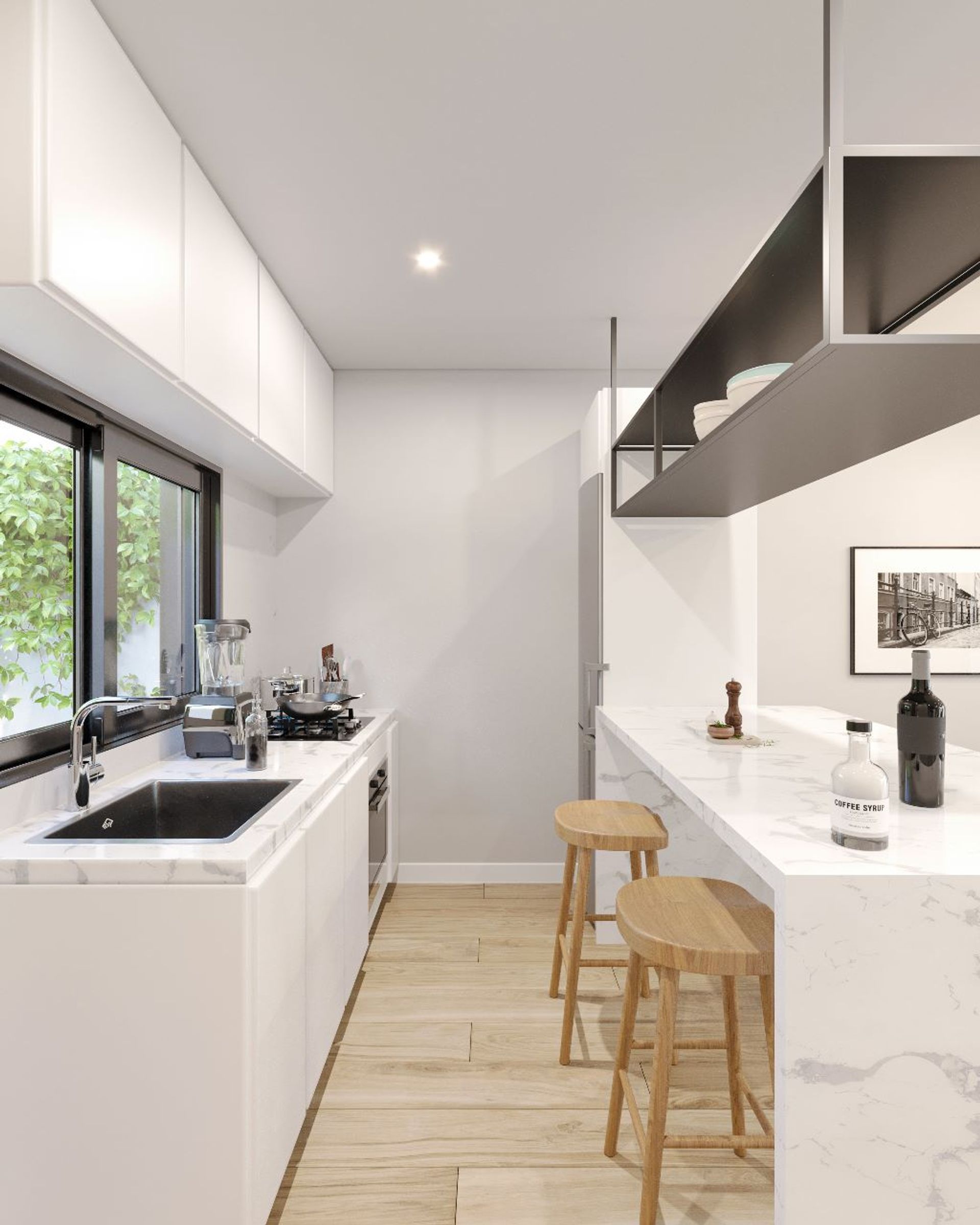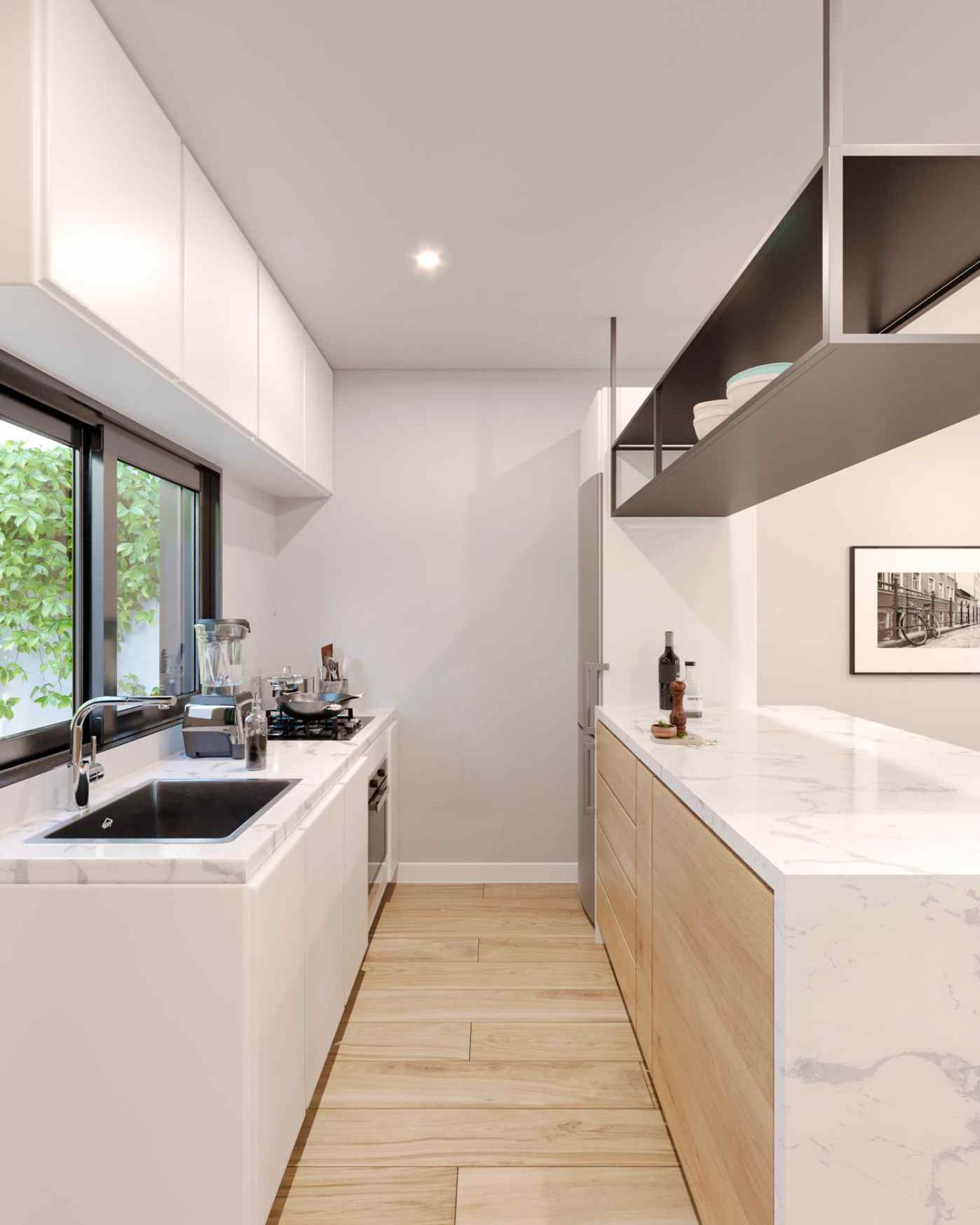 La planta baja ofrece un ingreso peatonal con jardín privado y cochera con portón automático. La cocina integrada, con desayunador, se conecta a una galería cubierta y a una parrilla, creando un espacio perfecto para reuniones familiares o sociales. El amplio living, con doble ventanal, se abre a la galería y al jardín, garantizando abundante luz natural. Un toilette de recepción complementa la entrada.