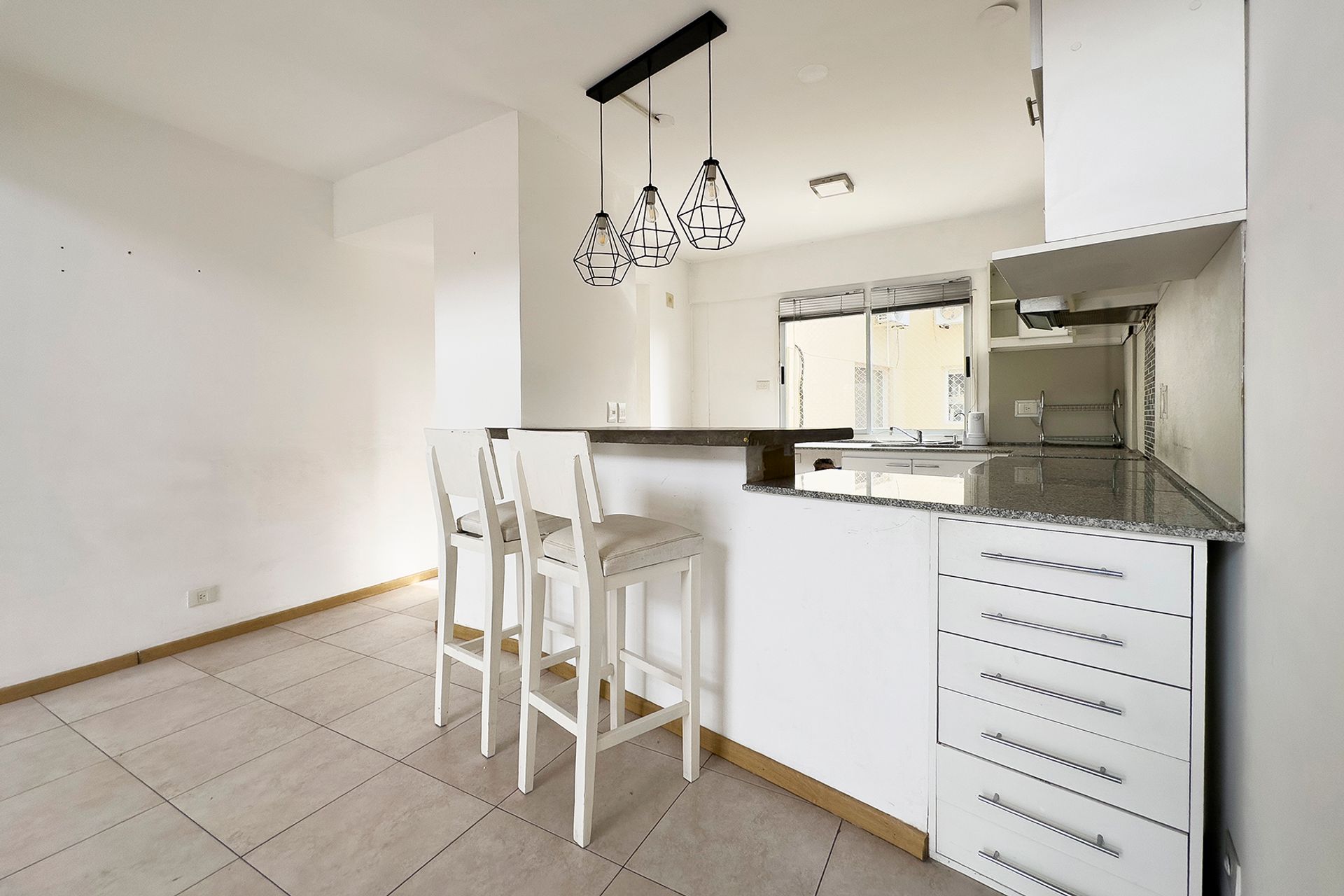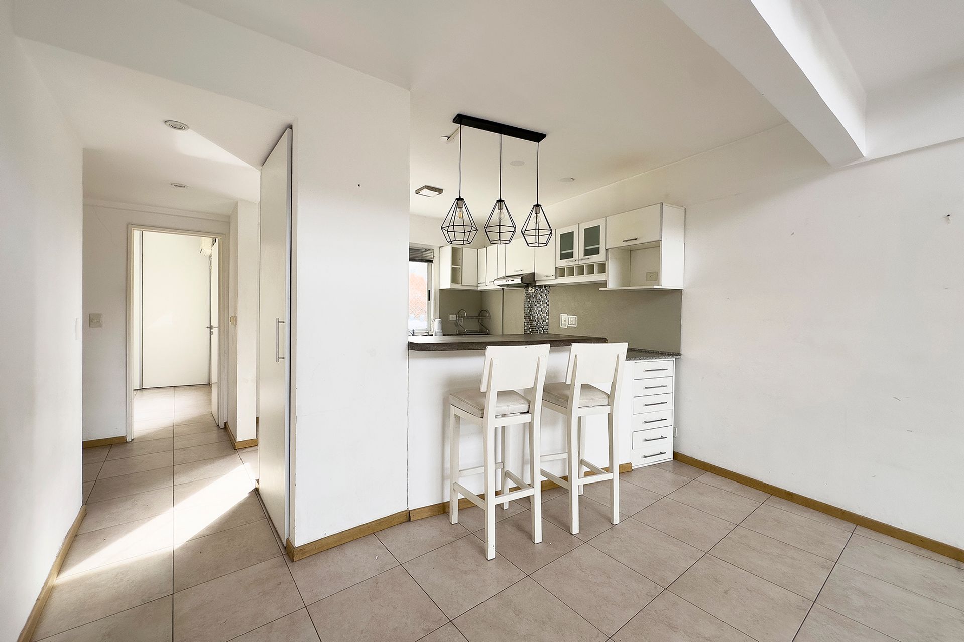 La cocina está integrada al living, con espacio para lavarropas y muy buen lugar de guardado.