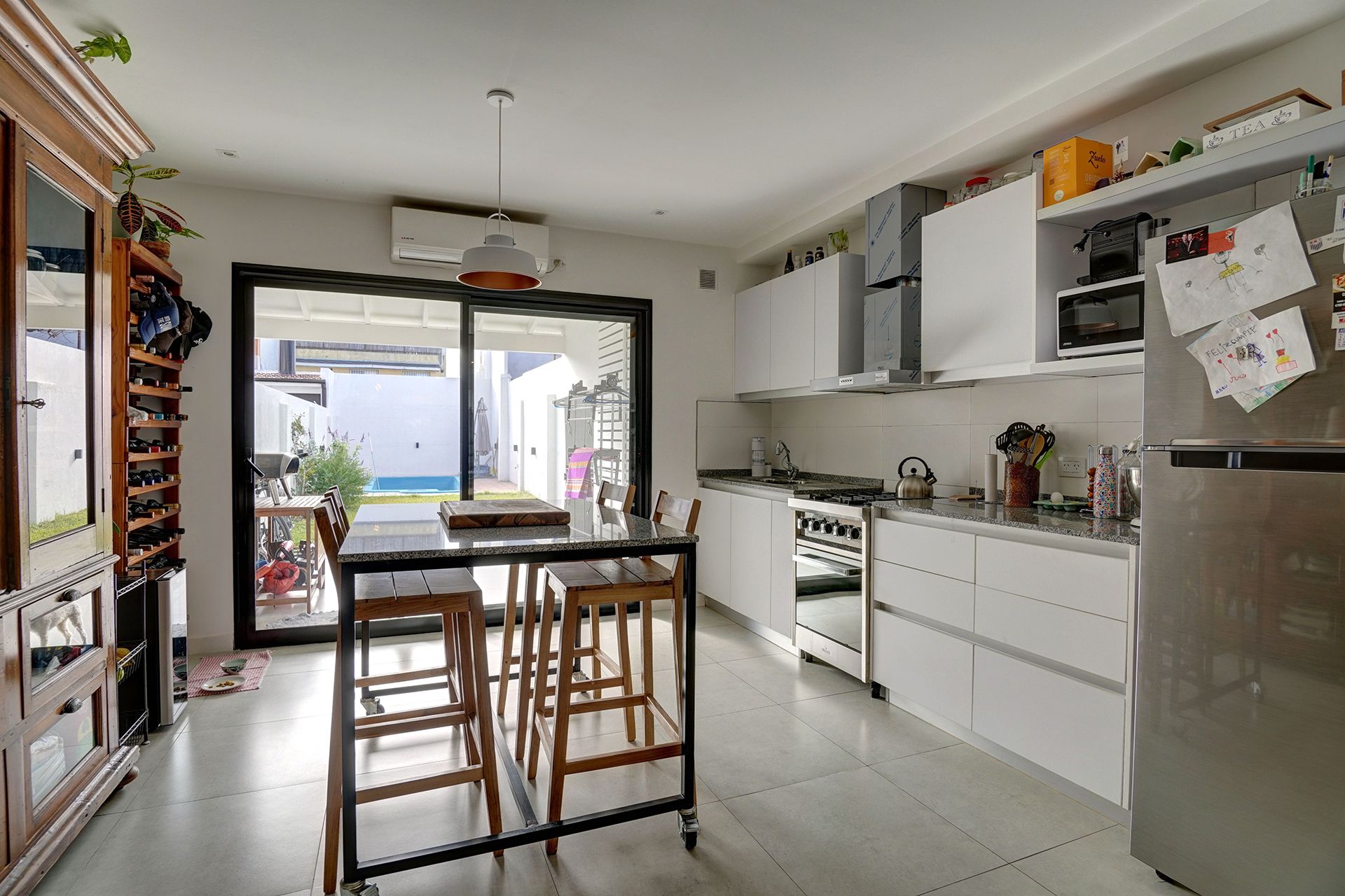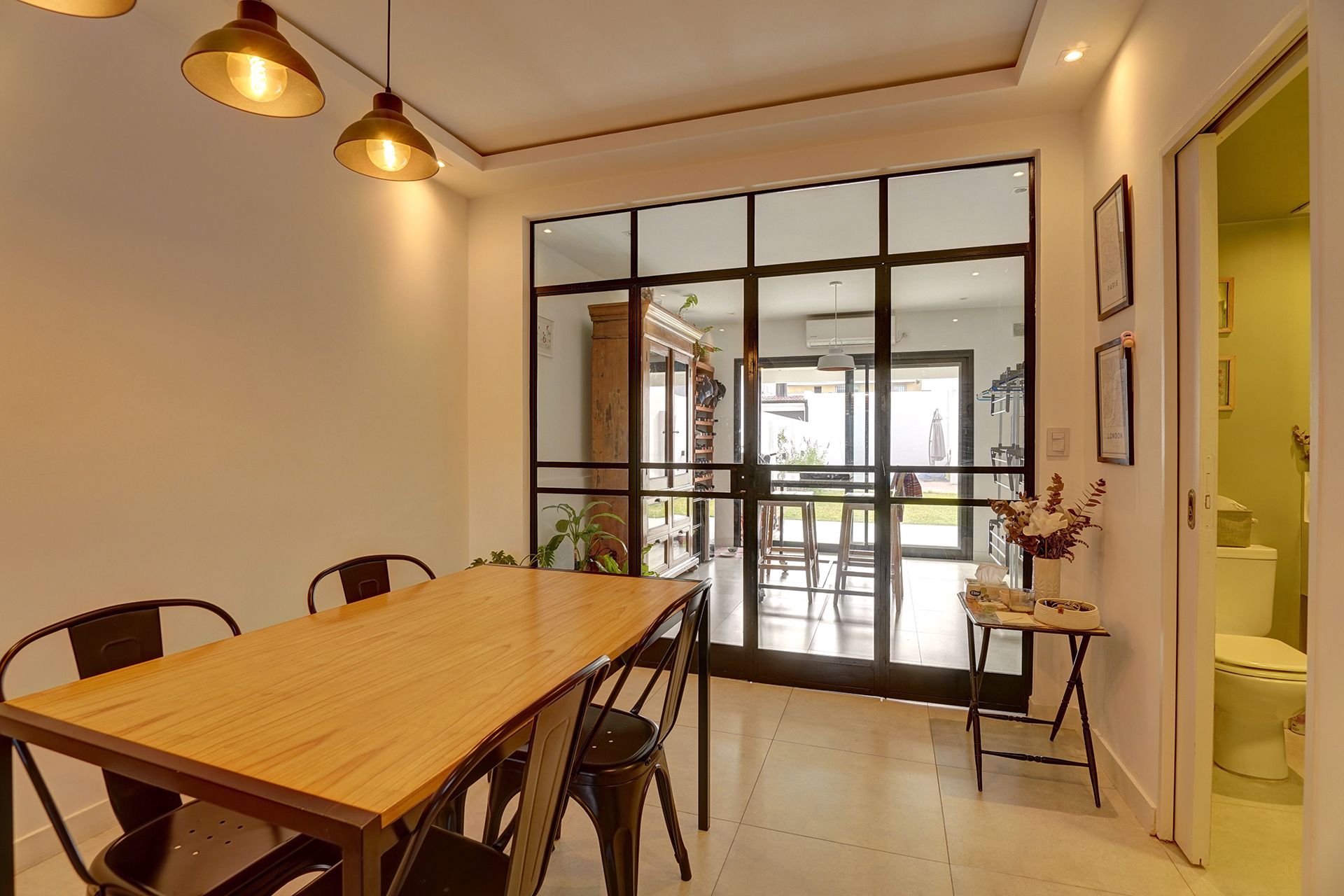 La planta baja recibe con un amplio garage descubierto y un luminoso living‑comedor que se abre a la cocina mediante una elegante división de vidrio. Un toilette en la zona de entrada facilita la estancia. La cocina, equipada con extractor, muebles y mesada de primera calidad, se conecta a una galería cubierta con parrilla y lavadero, perfecta para reuniones familiares o sociales. El fondo verde, con una refrescante pileta y abundante sol, invita a disfrutar de momentos al aire libre.
