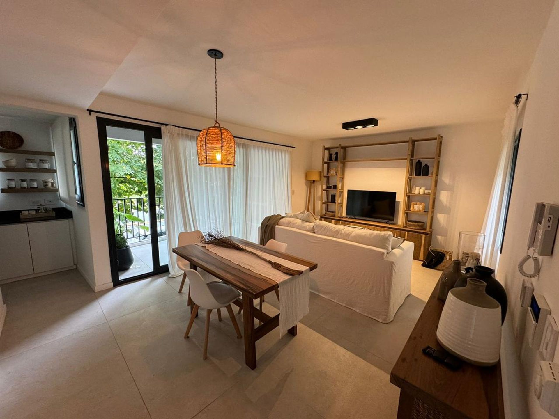 El dormitorio principal incluye un somier King y el segundo dormitorio 1 ½ plaza, mientras que el living cuenta con un diván cama, dos mesas de centro, un gran rack para televisor y consola en petiribí, y una mesa de comedor con cuatro sillas. Las cortinas en todos los ambientes y los black outs en dormitorios y vestidores garantizan confort y privacidad.