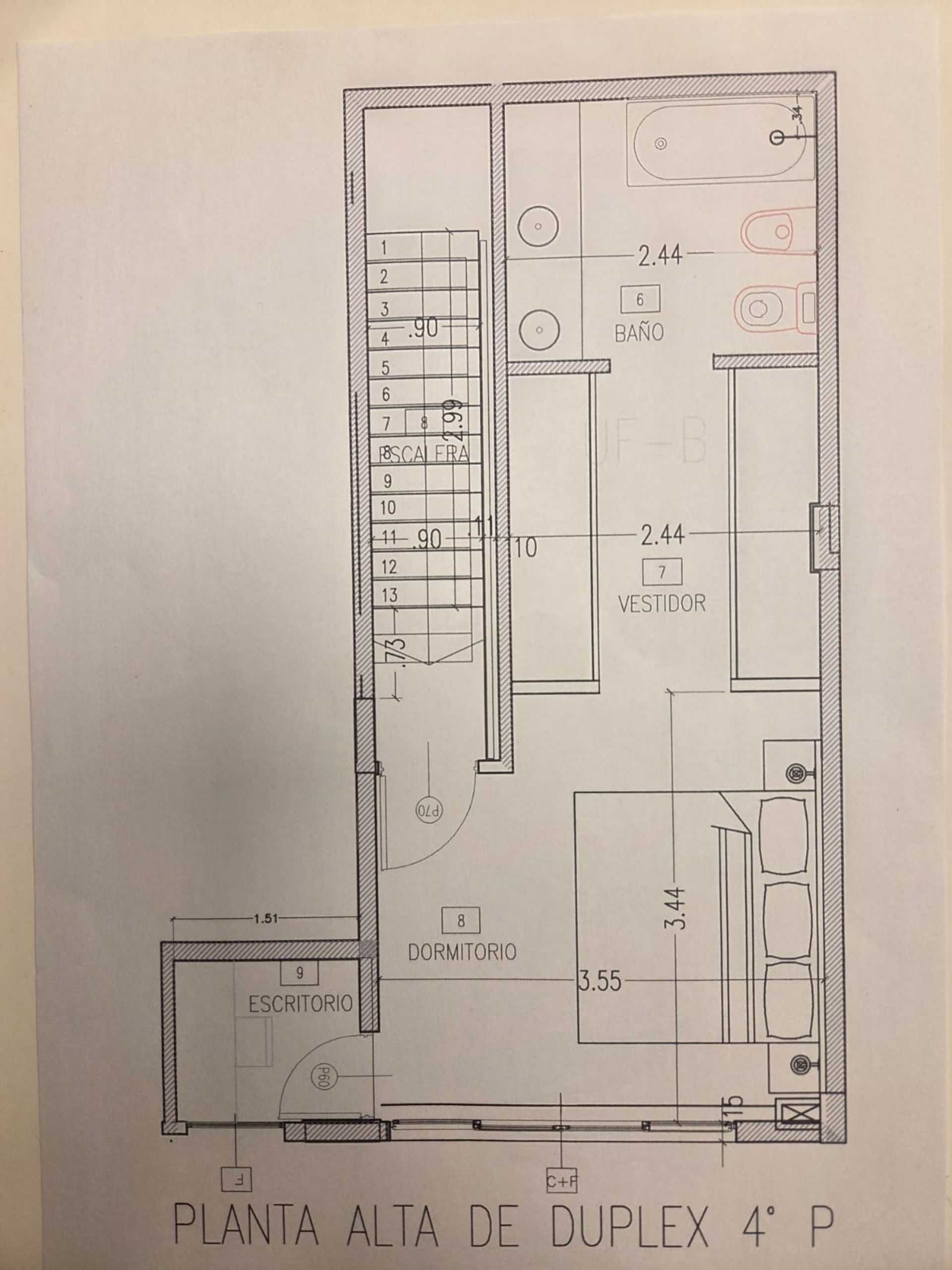 Esta unidad, ubicada en el cuarto piso, es un dúplex de dos ambientes con orientación nor‑oeste. El espacio principal incluye un amplio living comedor con cocina integrada, equipada con muebles bajos y altos, mesada, horno y SPAR, y con espacio destinado a lavarropas. El baño completo cuenta con acabados de cerámicos de primera calidad y un toilet de recepción. En la planta alta se encuentra un segundo baño con ventilación natural y una gran superficie divisble que permite crear un escritorio, vestidor o incluso un baño adicional, con todas las instalaciones listas. El balcón, situado al contrafrente, está aterrazado y dispone de parrilla, ideal para disfrutar del aire libre.