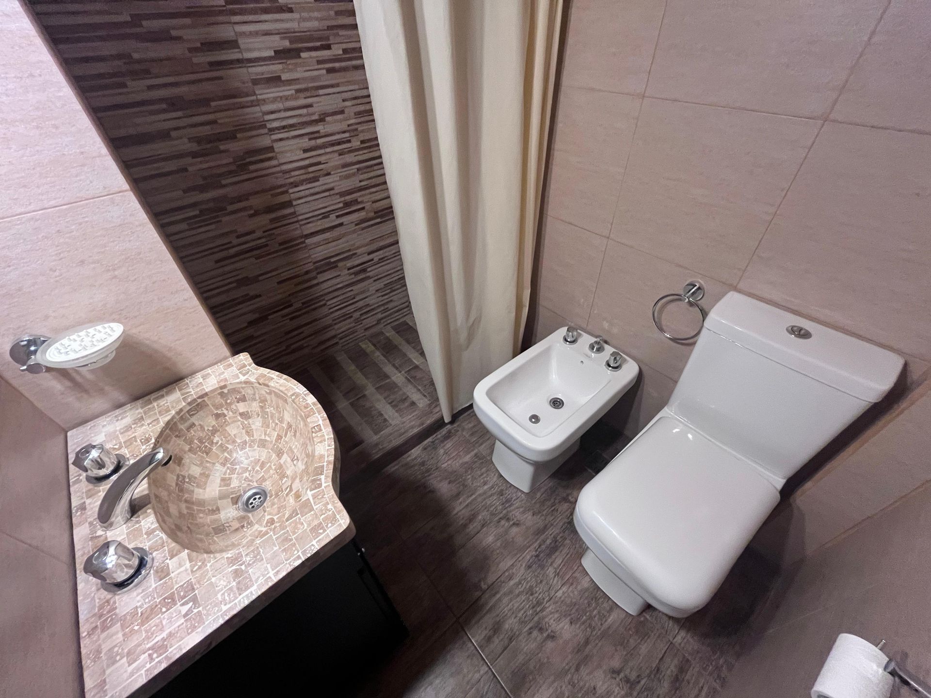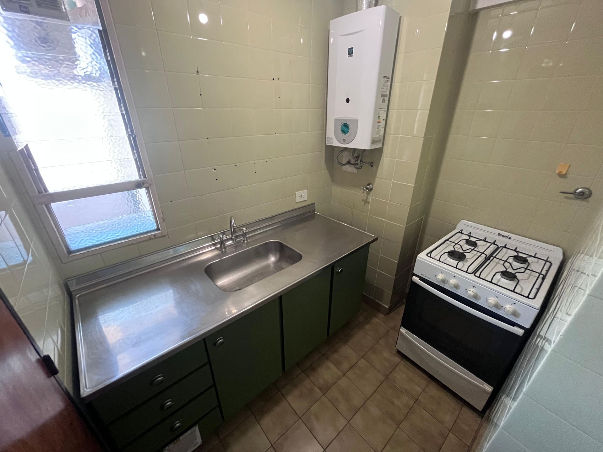 La cocina, separada del resto del espacio, cuenta con horno y calefón nuevos, facilitando la preparación de comidas con comodidad y eficiencia. El baño ha sido completamente renovado, incorporando materiales de alta calidad y un diseño contemporáneo.
