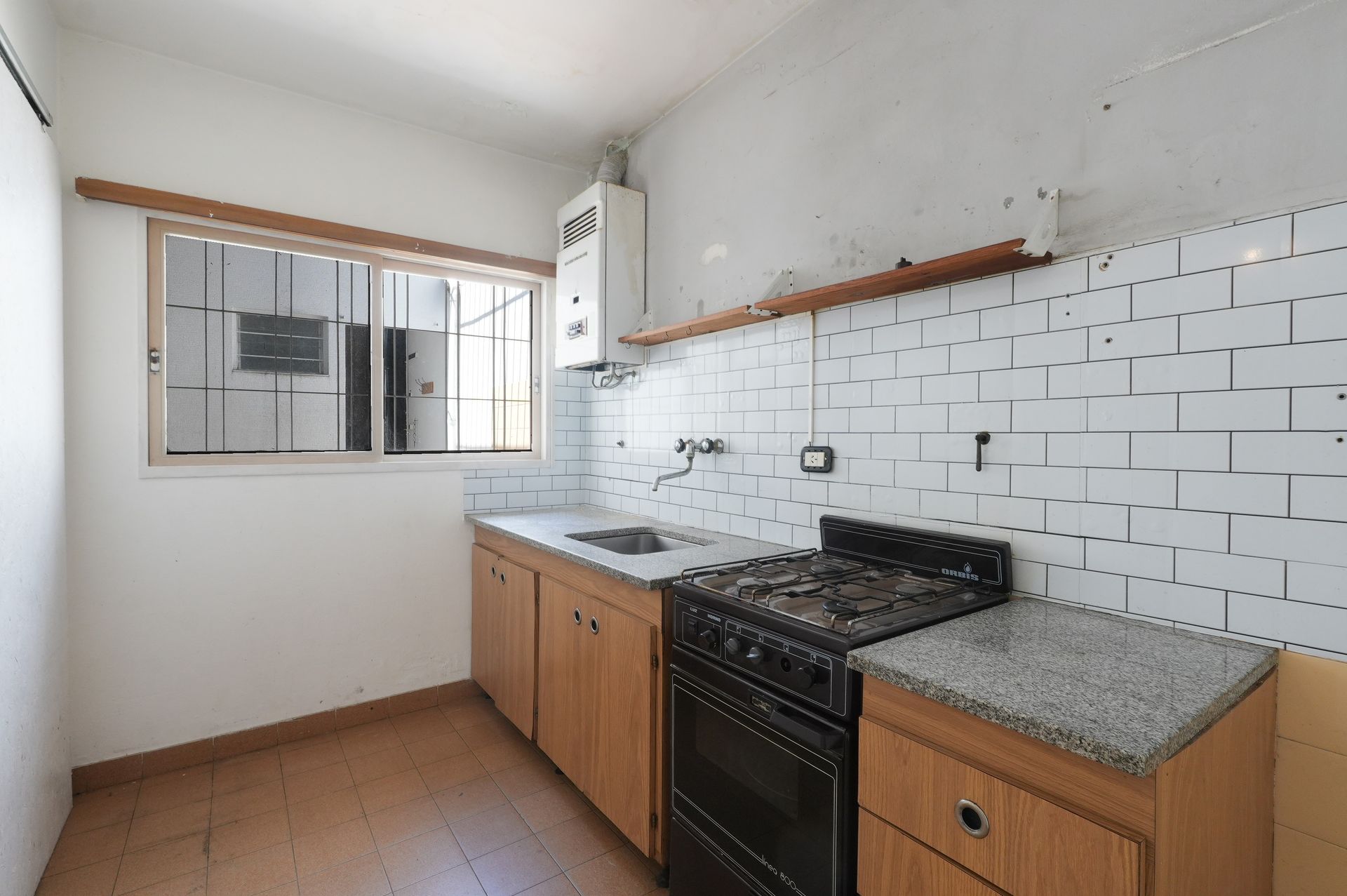 La cocina, separada del comedor, incluye un lavadero en el patio y un espacio adicional de almacenamiento, ideal para organizar el hogar. Desde el living se accede a la habitación, que cuenta con elegantes pisos de madera que aportan calidez y estilo. El baño completo, con ventana que favorece la ventilación, dispone de salida al patio y mantiene la estética de época, complementado con un calefón para mayor confort.