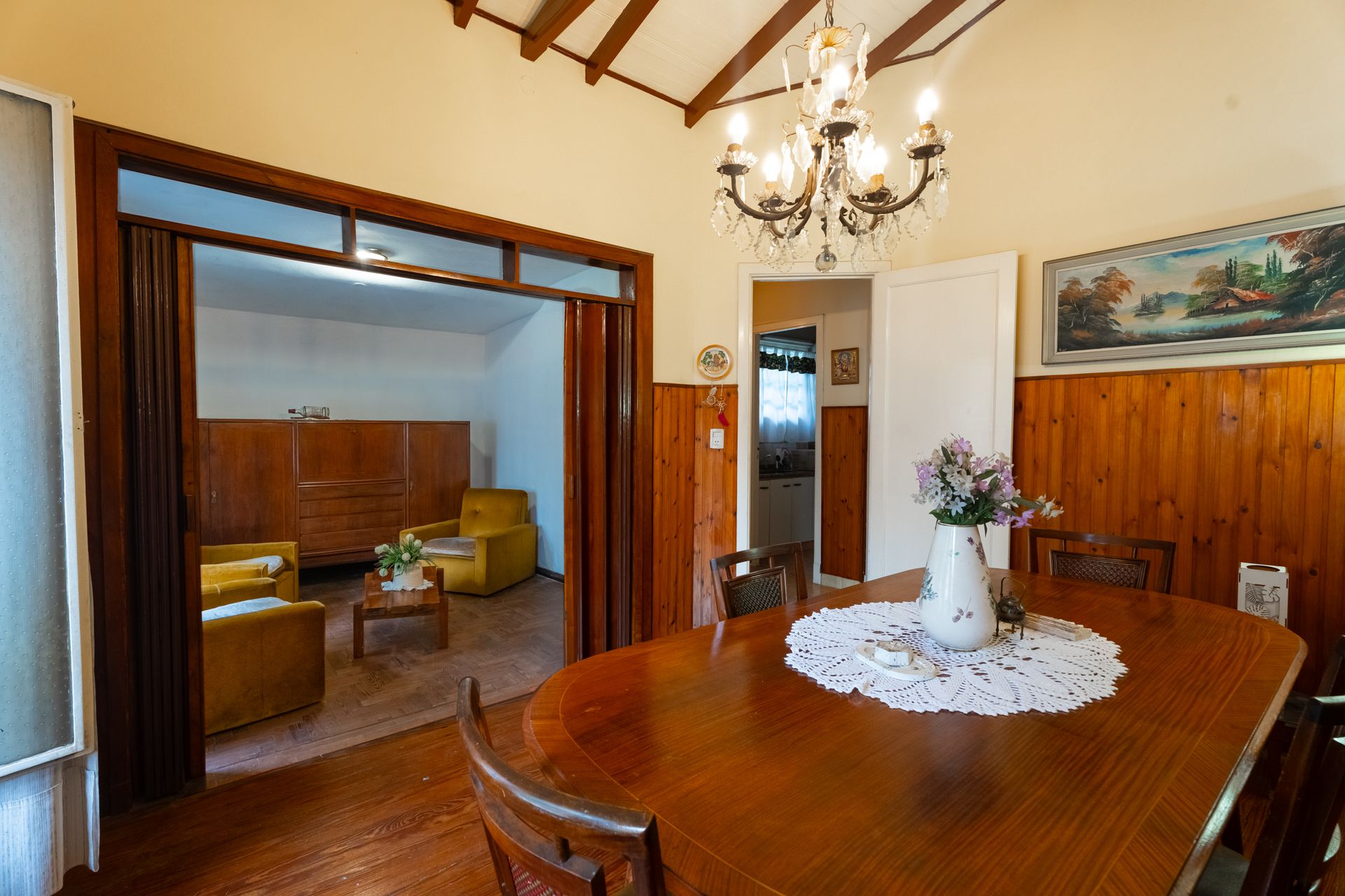 Se trata de un PH de cuatro ambientes, ubicado en Villa Adelina, en el límite de los partidos de San Isidro y Vicente López. Al entrar, el recibidor ofrece espacio para un auto pequeño y conduce al living comedor, donde los techos altos y las vigas de madera a la vista aportan una sensación de calidez y amplitud. A la derecha se encuentra la primera habitación, que actualmente funciona como sala de estar, y un hall de distribución que conecta el comedor, la cocina, el baño y el dormitorio principal.