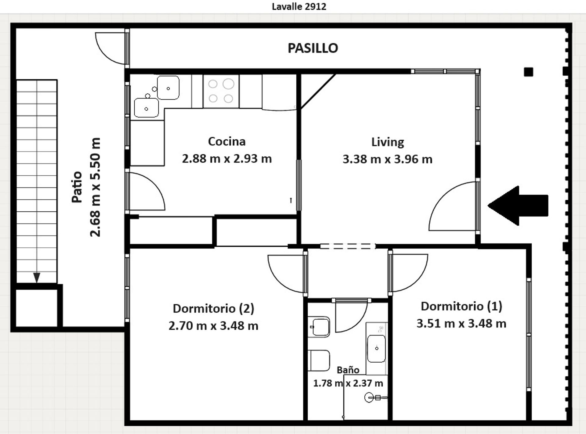 Al ingresar se abre un amplio living con hogar y ventanales que ofrecen una vista panorámica al frente. El dormitorio principal, también frontal, está revestido con pisos de madera que aportan calidez y elegancia. El segundo dormitorio, ubicado en el contrafrente, comparte el mismo acabado de madera y se beneficia de una iluminación natural equilibrada. El baño completo dispone de un box de ducha moderno y funcional. La cocina, amoblada con bajo mesada y alacena, facilita la preparación de comidas y se conecta con el patio para una transición fluida entre interior y exterior.
