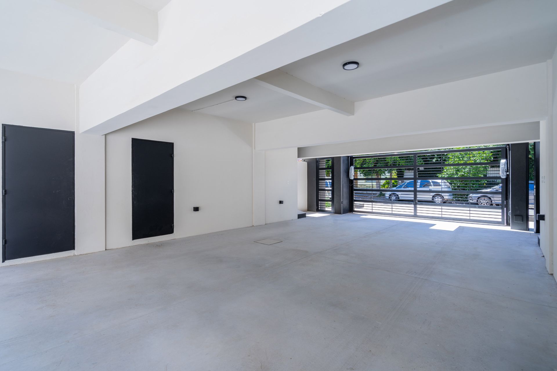 El acceso peatonal y vehicular se controla mediante portón levadizo de carpintería metálica, mientras que el cerco eléctrico perimetral con alarma brinda una capa adicional de seguridad para la propiedad.