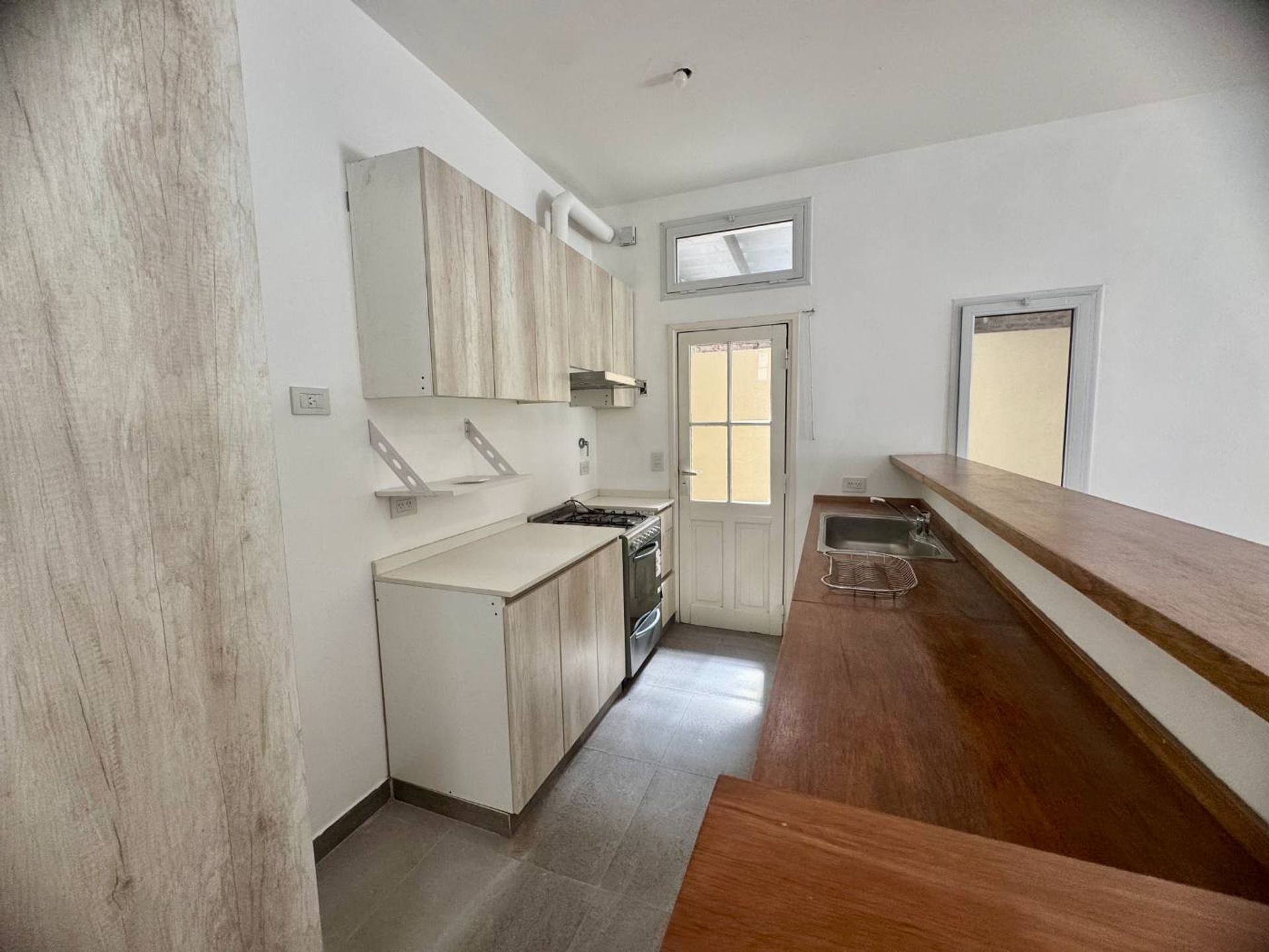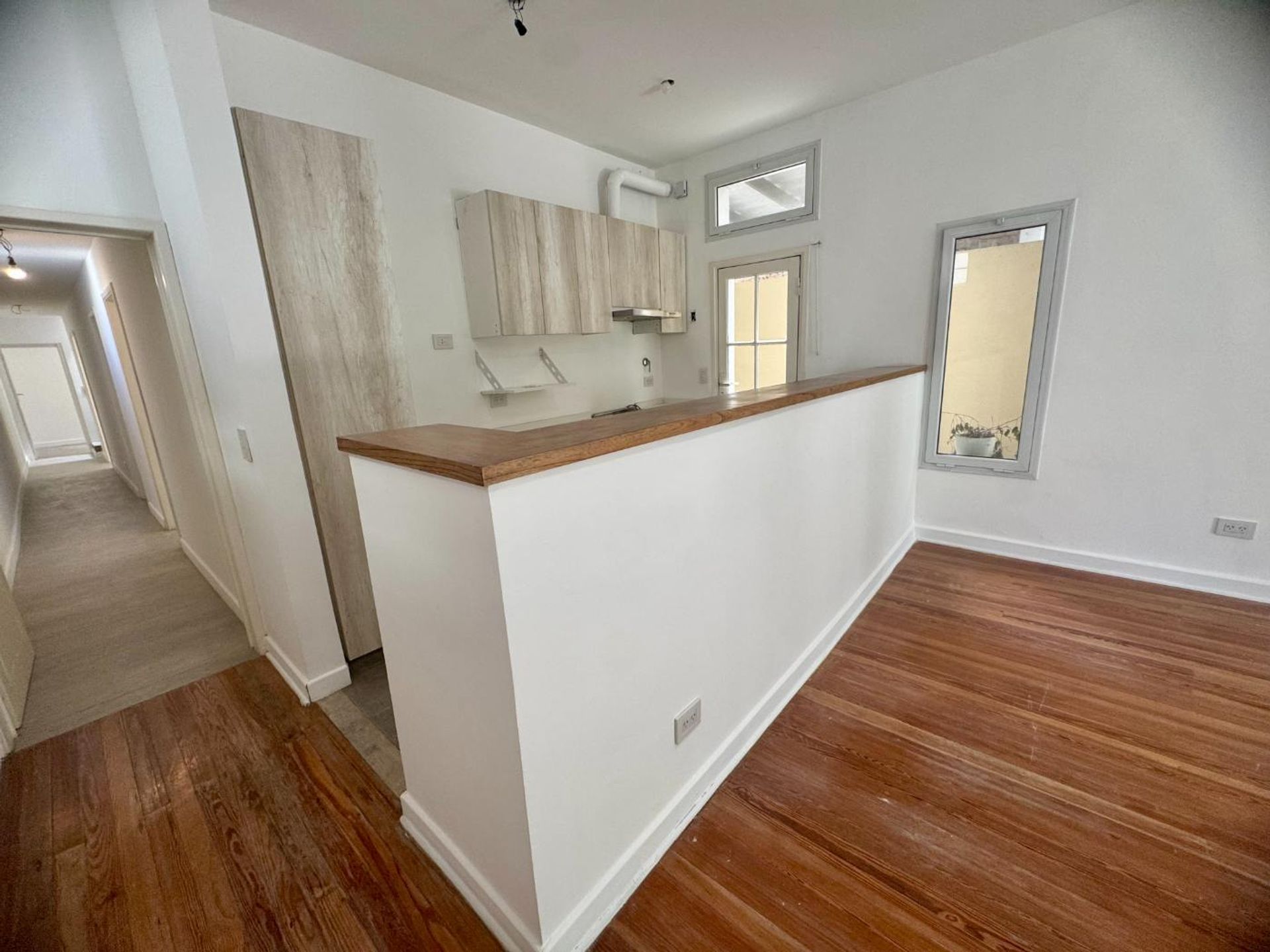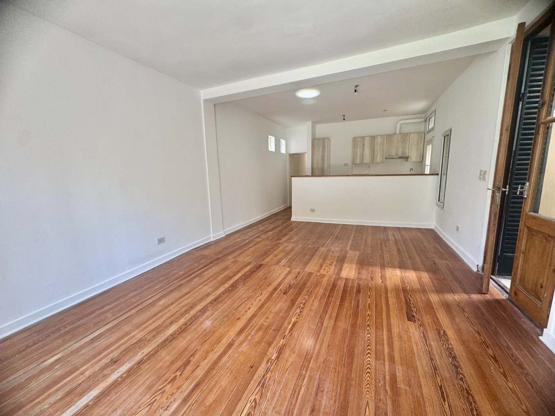El salón, amplio y luminoso, se integra armoniosamente con la cocina, creando un ambiente abierto y acogedor. Un claraboya estratégico aporta luz natural que realza la atmósfera interior. Los pisos de pinotea añaden un toque de calidez y sofisticación a cada ambiente.