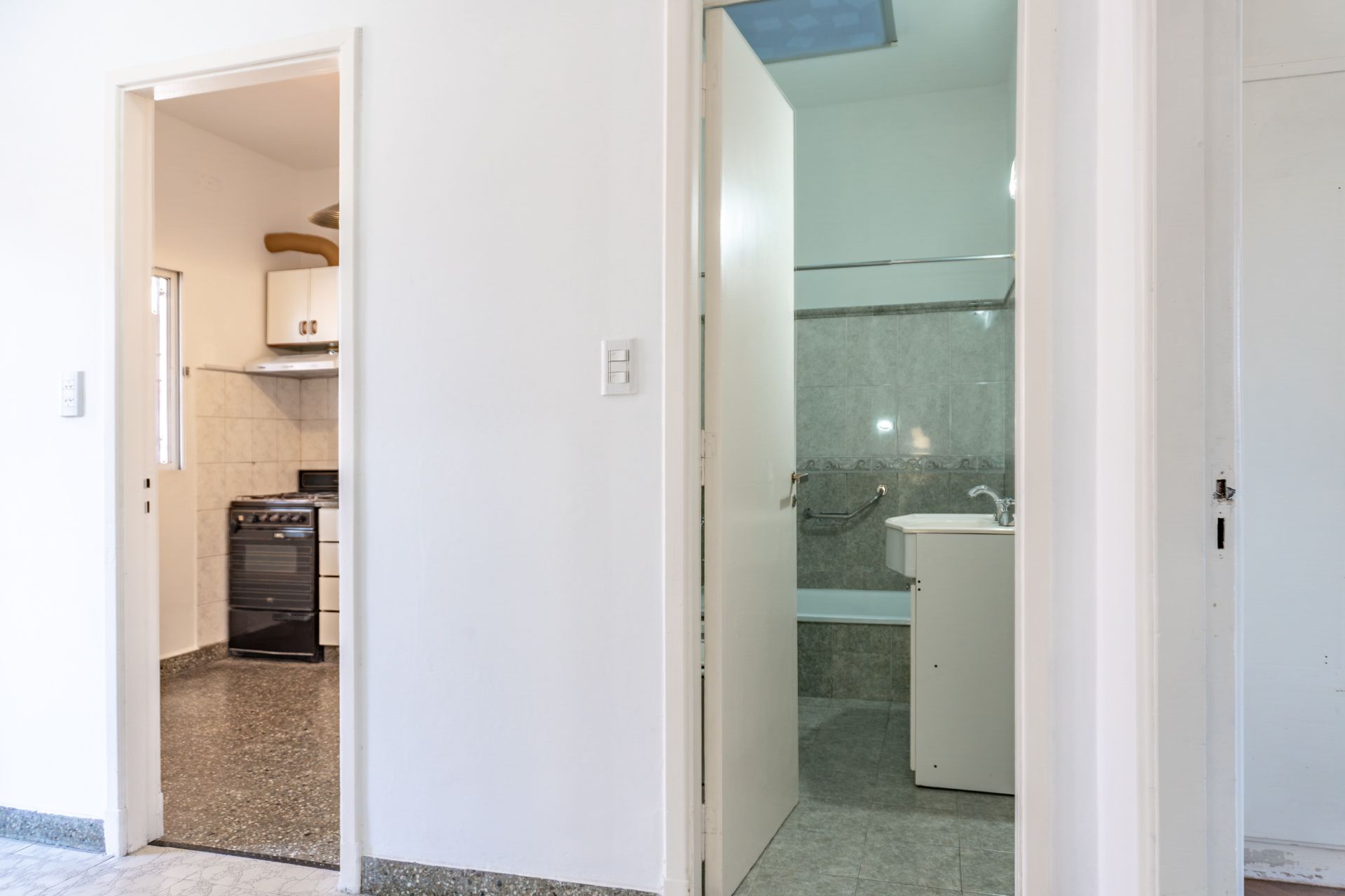 Dos dormitorios frontales muy luminosos con hermosos pisos de parquet restaurados. El dormitorio principal ofrece amplio espacio y un gran placard. Baño completo y cocina amplia y cómoda garantizan funcionalidad.