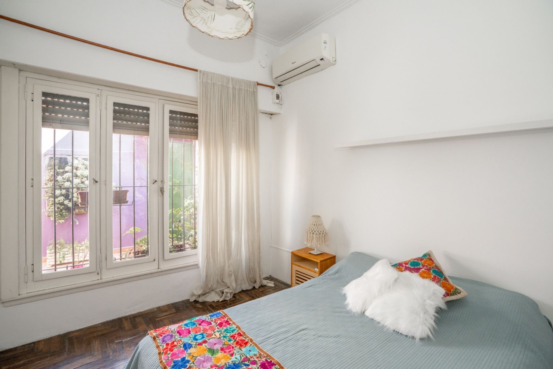 El baño principal es amplio y dispone de bañera, mientras que el dormitorio cuenta con vista al patio, placard empotrado y pisos de madera originales, complementados con persianas que regulan la luminosidad.