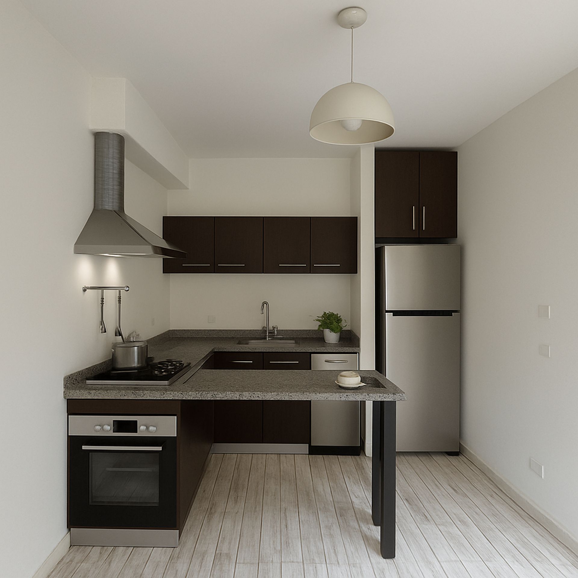 La cocina, funcional y moderna, dispone de barra desayunadora y extractor, ideal para la preparación de comidas y la convivencia en familia. El living es muy amplio, con luz natural abundante y espacio suficiente para crear un ambiente acogedor y versátil.