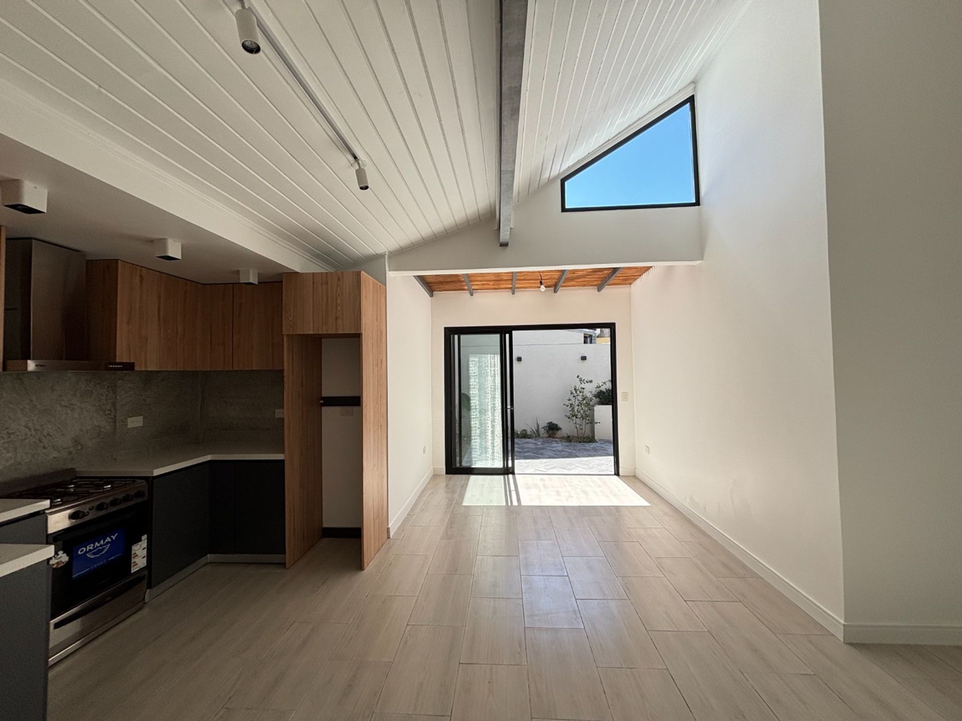 El diseño interior maximiza la luminosidad y la ventilación natural en cada rincón, con acceso al exterior desde todos los ambientes. Dos dormitorios, uno de ellos en suite, cuentan con grandes ventanales que inundan de luz el espacio. El amplio living-comedor, con cocina integrada, se presenta como el escenario ideal para momentos en familia o con amigos. La cocina, completamente equipada, incorpora muebles bajo mesada y detalles modernos que garantizan funcionalidad y estilo. El baño completo destaca por su diseño elegante y los modernos artefactos sanitarios. Un patio privado con galería semi-cubierta, rodeado de vegetación, invita a disfrutar del aire libre; junto a él se ubica una parrilla con mesada y bacha exterior, además de un espacio preparado para lavarropas. La preinstalación para aire acondicionado en todos los ambientes asegura confort durante todo el año.