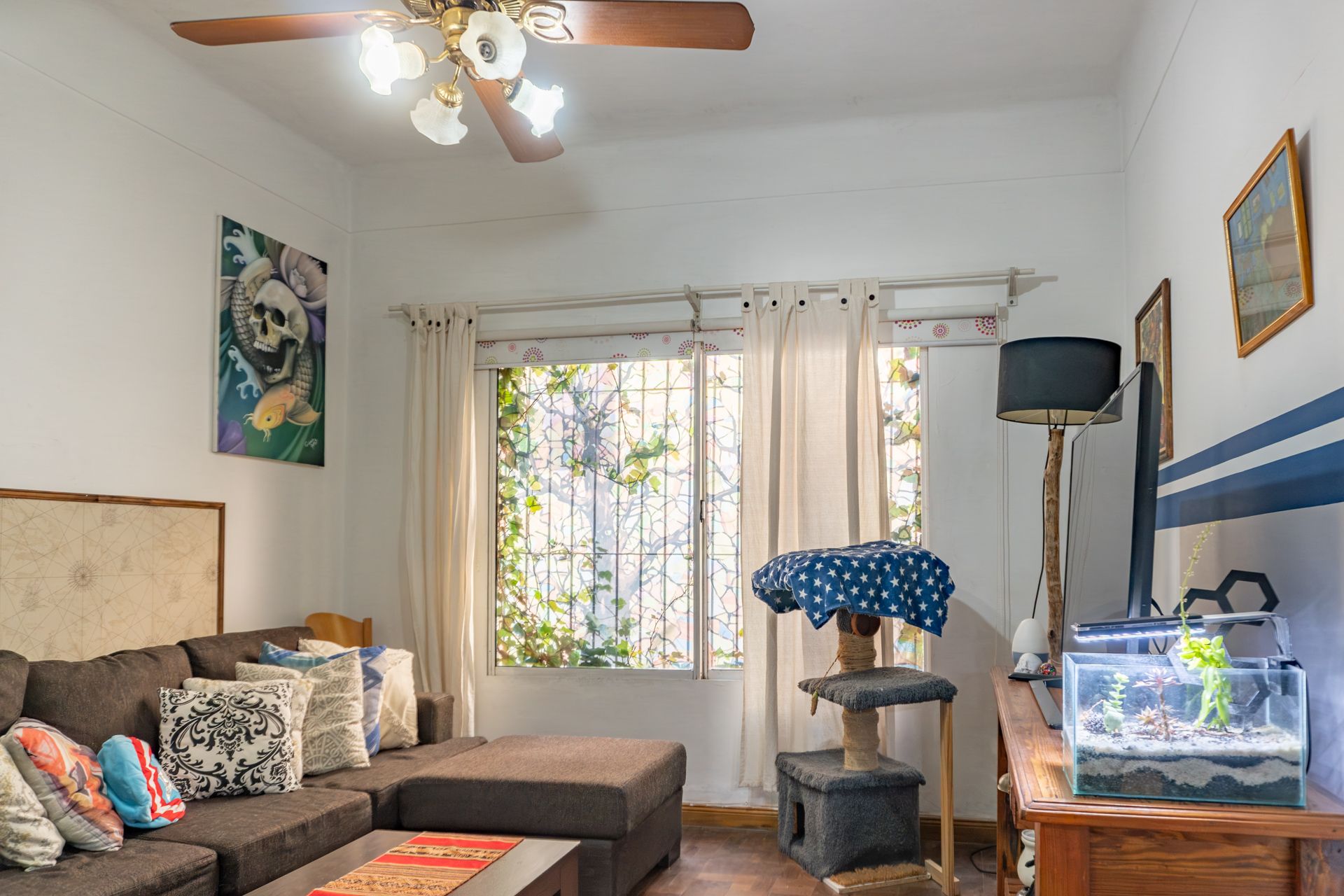 El exterior ofrece un jardín con parrilla, un cuarto de herramientas que puede convertirse en quincho y una terraza con posibilidad de construir una segunda planta.