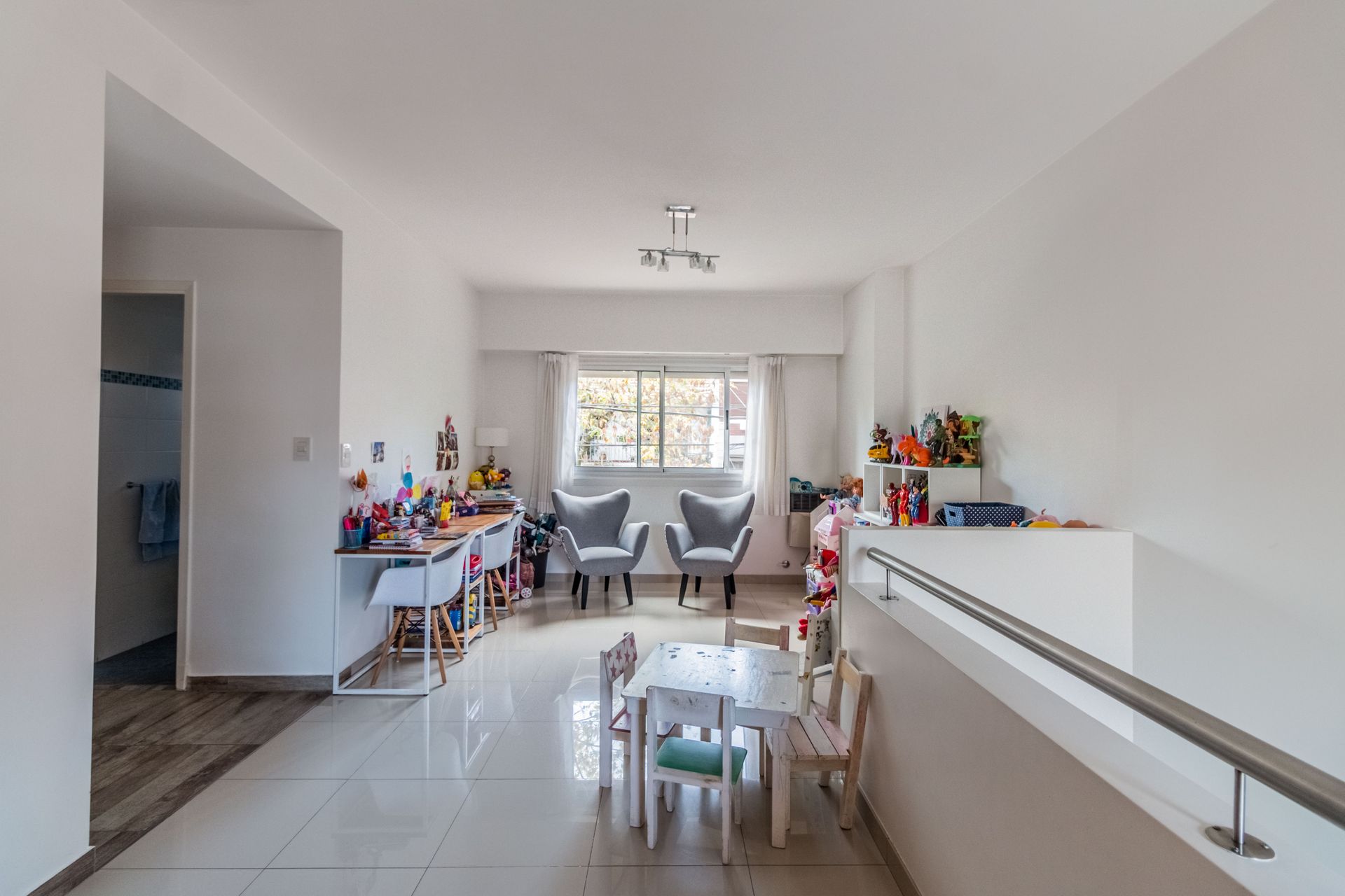 En el primer piso se encuentra un amplio living comedor que invita a la convivencia y el descanso, un playroom pensado para la recreación, una cocina semi integrada con barra desayunadora que combina estilo y comodidad, y un baño completo que complementa el espacio.