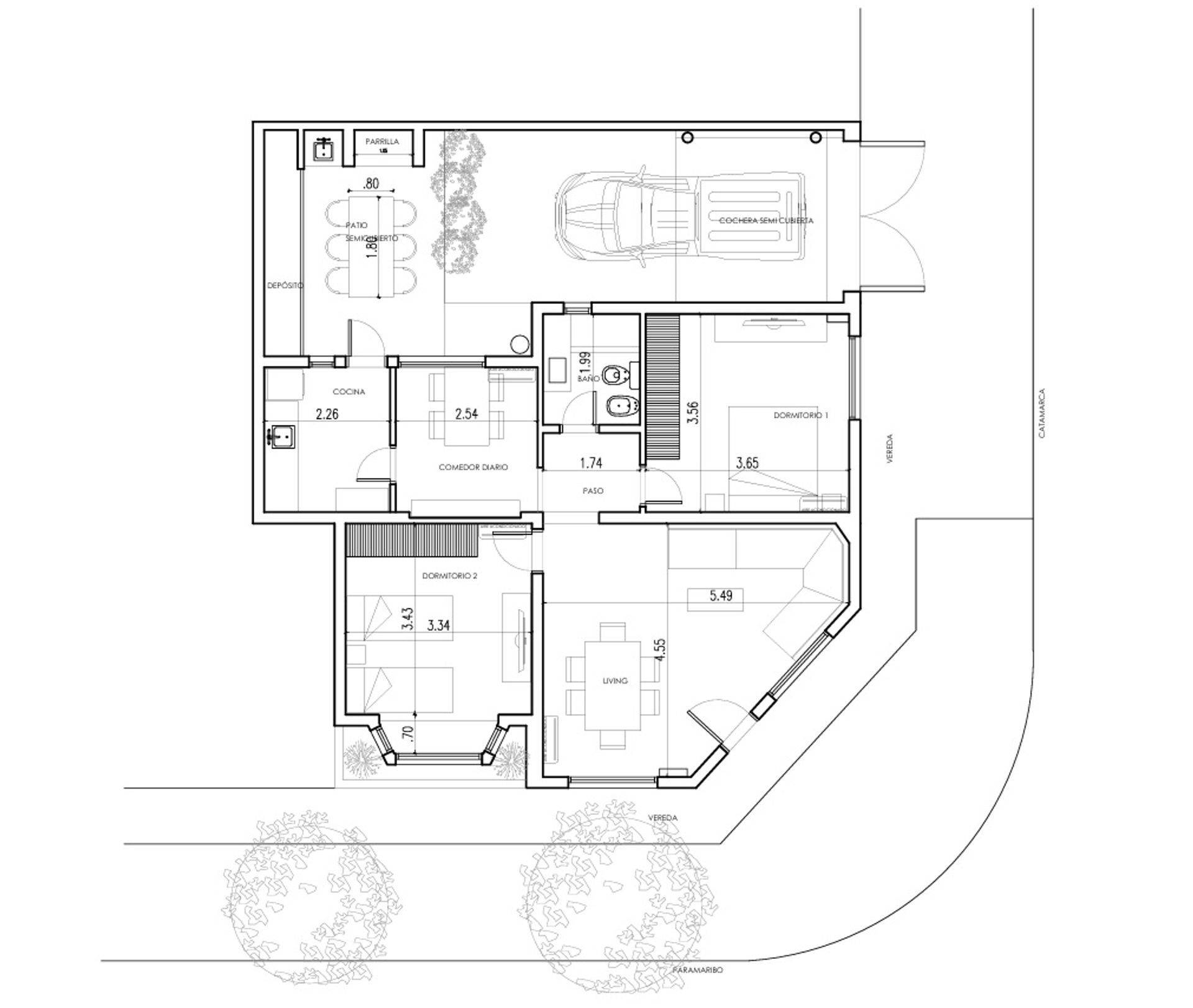 El ingreso se realiza tanto desde el garage con capacidad para dos vehículos como por la esquina a través de un acceso totalmente independiente, que se convierte en el primer indicio de la versatilidad del espacio. Desde el garage que también funciona como patio se accede directamente a uno de los dormitorios (hoy despacho) o a la cocina, generando una circulación fluida y natural.