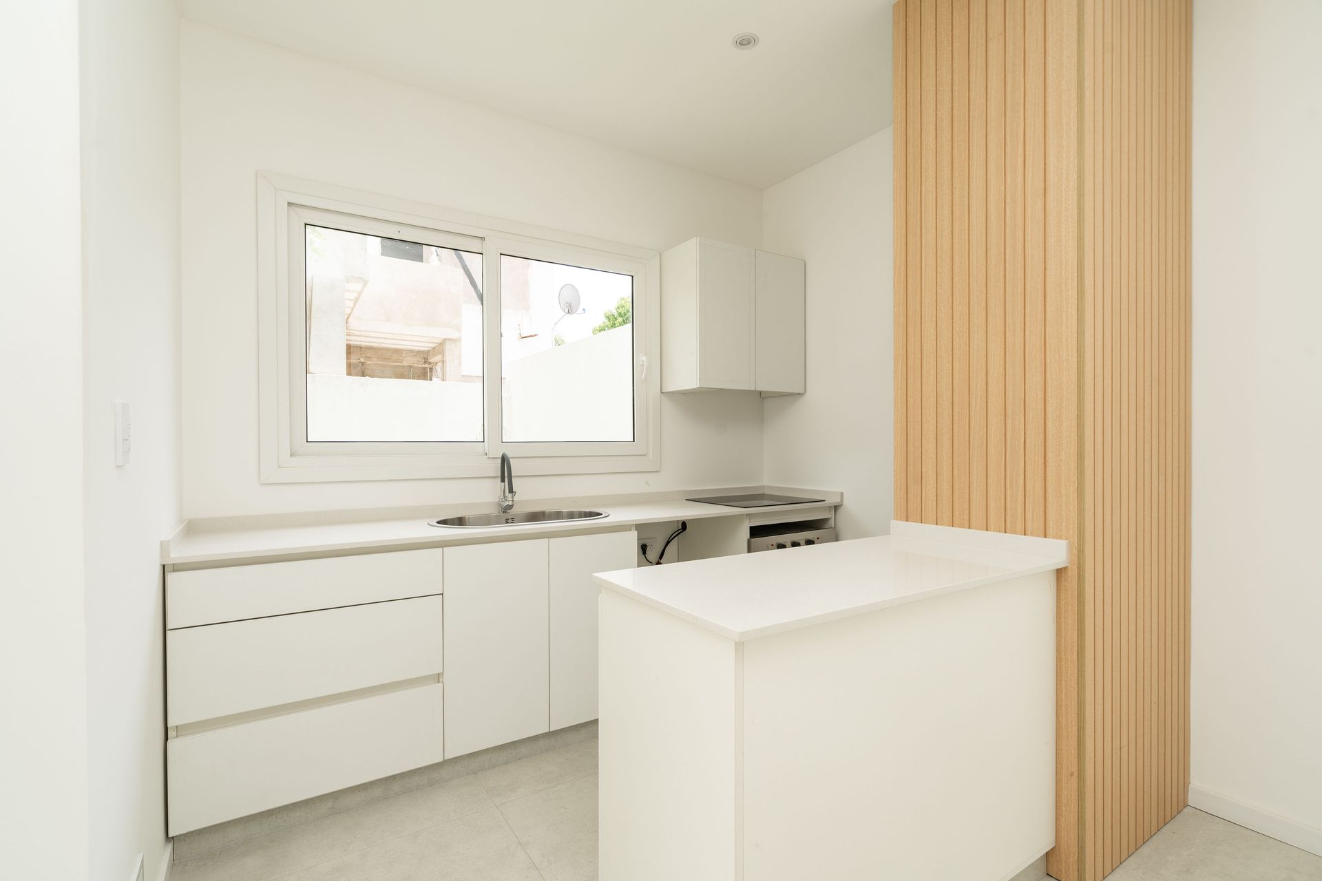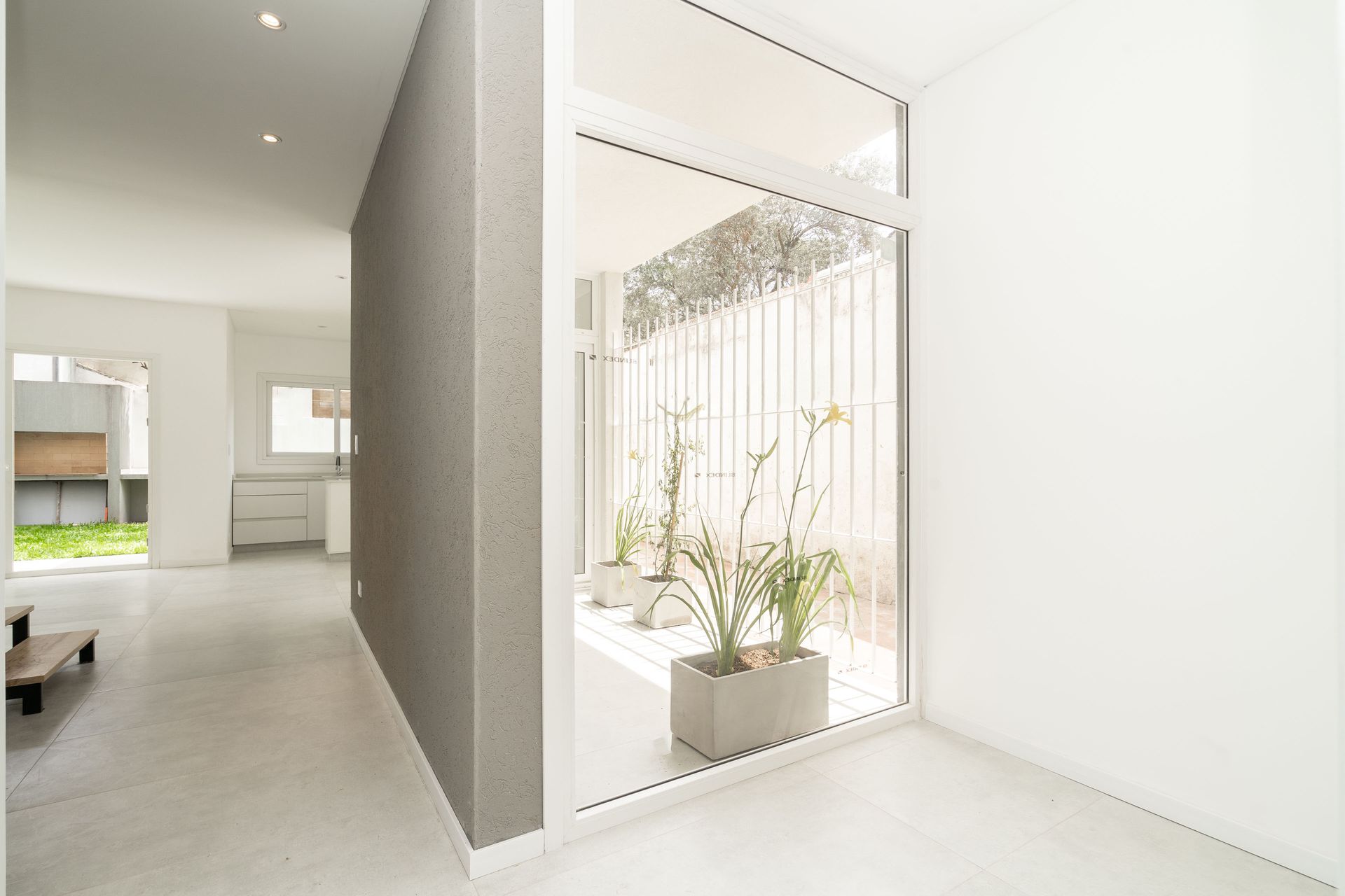 En la planta baja se ubica un hall de recepción que conduce a un tercer dormitorio (o escritorio / estudio) y a un toilette con ducha. El espacio de living comedor se abre a una cocina integrada con anafe y horno eléctrico, y dispone de espacio para lavarropa. El jardín con parrilla y el patio interno semicubierto complementan el entorno.