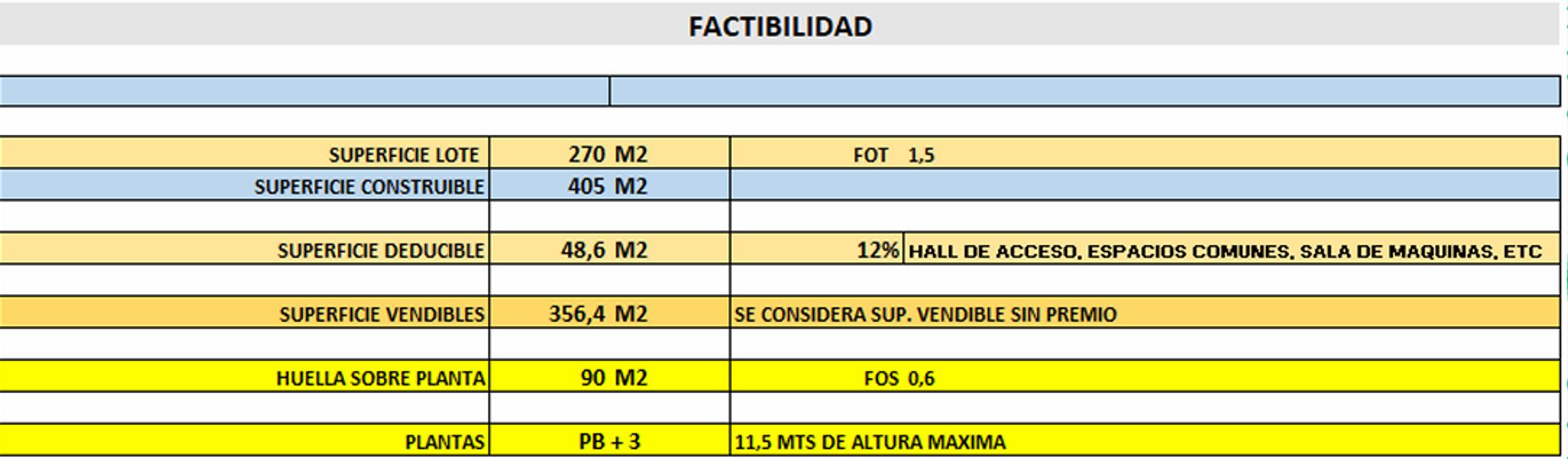 La normativa vigente permite una construcción total de aproximadamente 405 m². Esto lo convierte en una opción ideal para el desarrollo de dúplex, PHs o edificios de baja escala, así como para la construcción de una vivienda particular de categoría.