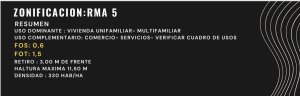 La superficie total es de 270 m², con medidas de 10 m de frente por 27 m de fondo. La zonificación RMa 5 lo habilita para vivienda unifamiliar, multifamiliar de baja densidad y comercio de escala barrial. Con un FOT de 1,5 y un FOS de 0,6, el terreno está nivelado, escriturado y listo para construir. El frente cuenta con portón, lo que facilita el resguardo de maquinaria y materiales durante la obra.