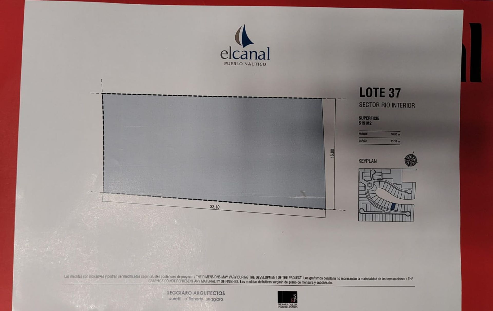 Lote de 519 m² (16,80 m frente x 33,10 m largo) ubicado en el Barrio El Canal de Villanueva, Tigre. Con orientación norte, el terreno recibe luz solar durante todo el día y dispone de salida directa al río, ofreciendo vistas y acceso inmediato a las aguas.