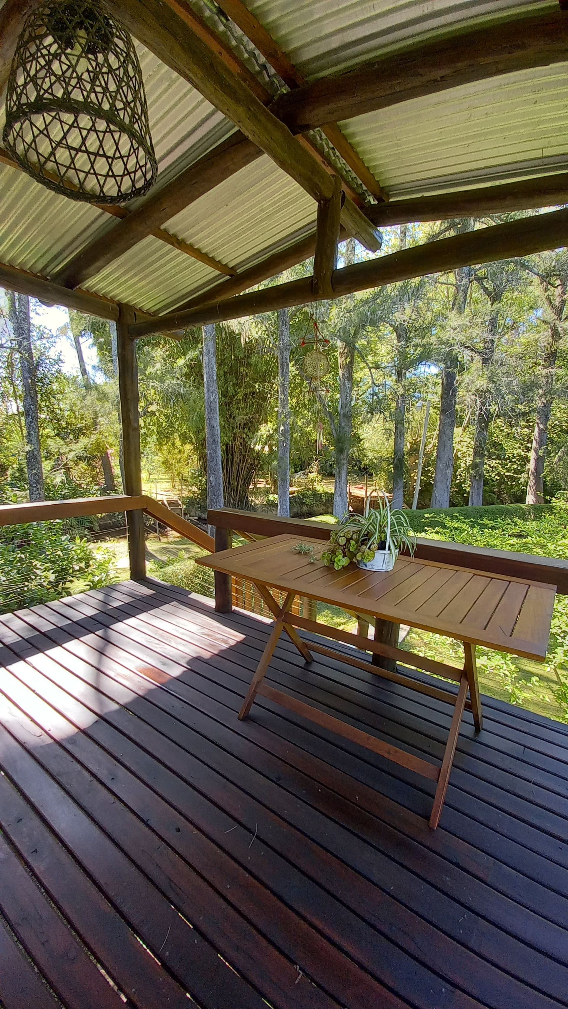 En el exterior, una galería con mesa y sillas invita a disfrutar de las vistas al agua y al entorno verde. Una parrilla está preparada para reuniones familiares o con amigos, aprovechando el aire libre.