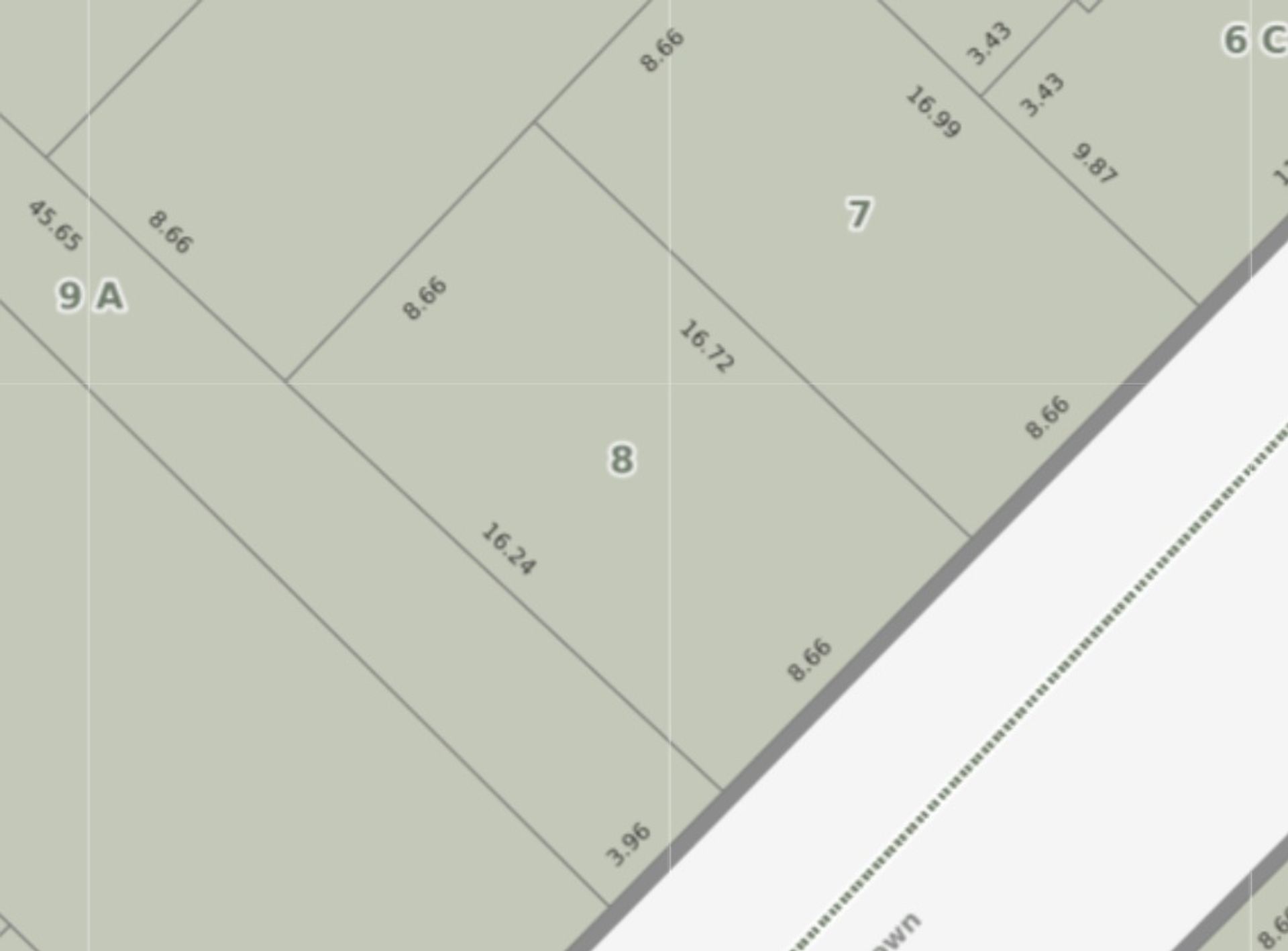 El lote dispone de 8,66 m de frente, 16,24 m de profundidad al sur, 9,28 m de contrafrente y 16,58 m al noreste, con una superficie total de 795,50 m². La normativa de construcción permite un FOS de 88,20 m y un FOT de 264,60 m, lo que habilita la edificación de hasta tres pisos. La altura máxima autorizada es de 11,20 m, ideal para un edificio bajo o una serie de dúplex bien pensados.